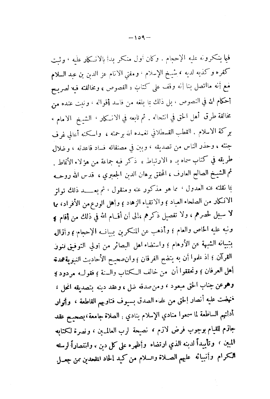 فِيمَا ينكرونه عَلَيْهِ الإحجام وَكَانَ أول مُنكر بَدَأَ بالإنكار عَلَيْهِ وَثَبت كفره وَكذبه لَدَيْهِ شيخ الْإِسْلَام ومفتي الانام عز الدّين بن عبد السَّلَام من أَنه مااتصل بِنَا أَنه وقف على كتاب (الفصوص (ومخالفته فِيهِ لصريح أَحْكَام الله فِي النُّصُوص بل ذَلِك بِمَا بلغه من فَاسد أَقْوَاله وتبت عِنْده من مُخَالفَة طرق أهل الْحق فِي انتحاله ثمَّ تَابعه فِي الْإِنْكَار الشَّيْخ الإِمَام بركَة الاسلام القطب الْقُسْطَلَانِيّ تغمده الله برحمته وَأَسْكَنَهُ أعالى غرف جنته وحذر النَّاس من تَصْدِيقه وَبَين فِي مصنفاته فَسَاد قَاعِدَته 2 وضلال طَرِيقه فِي كتاب سَمَّاهُ (ب (الارتباط (ذكر فِيهِ جمَاعَة من هَؤُلَاءِ الأنماط ثمَّ الشَّيْخ الصَّالح الْعَارِف الْمُحَقق برهَان الدّين الجعبري قدس الله روحه بِمَا نقلته عَنهُ الْعُدُول مِمَّا هُوَ مَذْكُور عَنهُ ومنقول ثمَّ بعد ذَلِك تَوَاتر الْإِنْكَار من الصلحاء الْعباد والأتقياء الزهاد وَأهل الْوَرع من الْأَفْرَاد مِمَّا لَا سَبِيل لحصرهم وَلَا تَفْصِيل ذكرهم إِلَى أَن أَقَامَ الله فِي ذَلِك من أَقَامَ وَنبهَ عَلَيْهِ الْخَاص وَالْعَام وأذهب عَن المنكرين ببيانه الإحجام وأزال بتبيانه الشُّبْهَة عَن الأوهام واستضاء أهل البصائر من أولي التَّوْفِيق بِنور الْقُرْآن إِذْ علمُوا أَن بِهِ يَتَّضِح الْفرْقَان وَإِن صَحِيح الْأَحَادِيث النَّبَوِيَّة عُمْدَة أهل الْعرْفَان وتحققوا أَن من خَالف الْكتاب وَالسّنة فَقَوله مَرْدُود وَهُوَ عَن جناب الْحق مبعود وَمن صدقه ضل وَعقد دينه بتصديقه انحل فَنَهَضت عَلَيْهِ أنصار الْحق من عُلَمَاء الصدْق بسيوف فتاوابهم القاطعة وأنوار أدلتهم الساطعة لما سمعُوا مُنَادِي الْإِسْلَام يُنَادي الصَّلَاة جَامِعَة بِصَحِيح عقد جازم للْقِيَام بِوُجُوب فرض لَازم نصيحة لرب الْعَالمين وَنَصره لكتابه الْمُبين وتأييدا لدينِهِ الَّذِي ارْتَضَاهُ وأظهره على كل دين وانتصارا لرسله الْكِرَام وأنبيائه عَلَيْهِم الصَّلَاة وَالسَّلَام من كيد الحاد الْمُلْحِدِينَ مِمَّن جعل