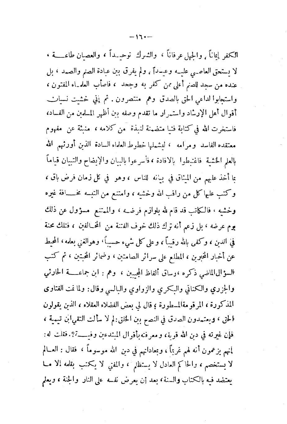 الْكفْر إِيمَانًا وَالْجهل عرفانا والشرك توحيدا والعصيان طَاعَة لَا يسْتَحق العَاصِي عَلَيْهِ وعيدا وَلم يفرق بَين عبَادَة الصَّنَم والصمد بل عِنْده من سجد للصنم أَعلَى مِمَّن كفر بِهِ وَجحد فَأصَاب الْعلمَاء الْمفْتُون واستجابوا لداعي الْحق بِالصّدقِ وهم منتصرون ثمَّ إِنِّي خشيت نِسْيَان أَقْوَال أهل الإرشادواستمرار مَا تقدم وَصفه بَين أظهر الْمُسلمين من الْفساد فاستخرت الله فِي كِتَابَة فتيا متضمنة لنبذة من كَلَامه منبئة عَن مَفْهُوم معتقده الْفَاسِد ومرامه ليشملها خطوط الْعلمَاء السَّادة الَّذين أورثهم الله بِالْعلمِ الخشية فاغتبطوا بالإفادة فَأَسْرعُوا بِالْبَيَانِ والإيضاح والتبيان قيَاما بِمَا أَخذ عَلَيْهِم من الْمِيثَاق فِي بَيَانه للنَّاس وَهُوَ فِي كل زمَان فرض بَاقٍ وَكتب عَلَيْهَا كل من راقب الله وخشيه وَامْتنع من التبسه مَخَافَة غَيره وخشيه فالكاتب قد قَامَ لله بلوازم فَرْضه والممتنع مسؤول عَن ذَلِك يَوْم عرضه بل زعم أَنه ترك ذَلِك خوف الْفِتْنَة من الْمُخَالفين فَتلك محنة فِي الدّين وَكفى بِاللَّه رقيبا وعَلى كل شيئ حسيبا وهوالغني بِعِلْمِهِ الْمُحِيط عَن أَخْبَار المخبرين المطلع على سرائر الصامتين وضمائر المخبتين ثمَّ كتب السُّؤَال الْمَاضِي ذكره وسَاق أَلْفَاظ المجيبين وهم ابْن جمَاعَة الْحَارِثِيّ والجزري والكناني والبكري والزواوي والباسلي وَقَالَ وَلما تمت الْفَتَاوَى الْمَذْكُورَة المرموقة المسطورة قَالَ لي بعض الْفُضَلَاء الْعُقَلَاء الَّذين يَقُولُونَ الْحق ويعتمدون الصدْق فِي النصح بَين الْخلق لم لَا سَأَلت التقي ابْن تَيْمِية فَأن غيرته فِي دين الله قَوِيَّة ومعرفته بأقوال المبتدعين وَفِيه فَقلت لَهُ إِنَّهُم يَزْعمُونَ أَنه لَهُم غريما وبمعاداتهم فِي دين الله موسوما فَقَالَ الْعَالم لَا يستخصم وَالْحَاكِم الْعَادِل لَا يستظلم والمفتي لَا يكْتب بقلمه إِلَّا مَا يتعضد فِيهِ بِالْكتاب وَالسّنة بعد أَن يعرض نَفسه على النَّار وَالْجنَّة وَيعلم