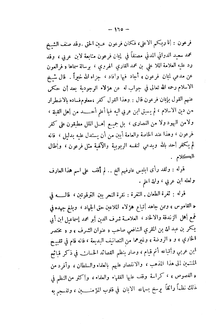 فِرْعَوْن أَنا ربكُم الاعلى فَكَانَ فِرْعَوْن عين الْحق وَقد صنف الشَّيْخ مُحَمَّد سعيد الدواني الْمدنِي مصنفا فِي إِيمَان فِرْعَوْن مُتَابعَة لِابْنِ عَرَبِيّ وَقد رد عَلَيْهِ الْعَلامَة الملا عَليّ بن مُحَمَّد الْقَارِي الْهَرَوِيّ برسالة سَمَّاهَا (فر العون عَن مدعي إِيمَان فِرْعَوْن (أَجَاد فِيهَا وَأفَاد جزاه الله خيرا قَالَ شيخ الاسلام رَحمَه الله تَعَالَى فِي جَوَاب لَهُ عَن هَؤُلَاءِ الوجودية بعد أَن حكى عَنْهُم القَوْل بِإِيمَان فِرْعَوْن قَالَ وَهَذَا القَوْل كفر مَعْلُوم فَسَاده بالاضطرار من دين الاسلام لم يسْبق ابْن عَرَبِيّ اليه فِيمَا أعلم أحد من أهل الْقبْلَة وَلَا من الْيَهُود وَلَا من النَّصَارَى بل جَمِيع أهل الْملَل مطبقون على كفر فِرْعَوْن وَهَذَا عِنْد الْخَاصَّة والعامة أبين من أَن يسْتَدلّ عَلَيْهِ بِدَلِيل فَإِنَّهُ لم يكفر أحد بِاللَّه وَيَدعِي لنَفسِهِ الربوبية والآلهية مثل فِرْعَوْن وَأطَال الْكَلَام