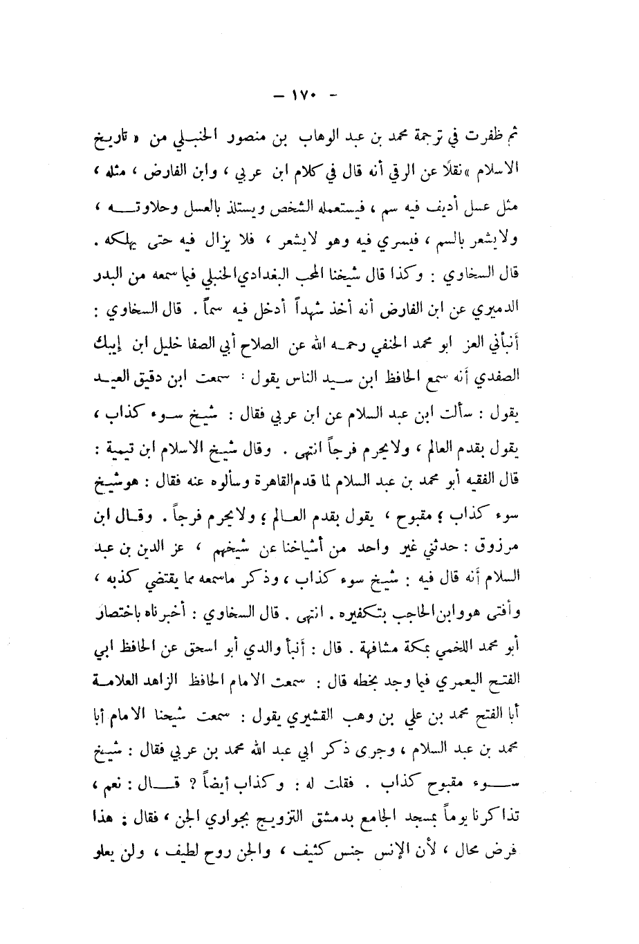 ثمَّ ظَفرت فِي تَرْجَمَة مُحَمَّد بن عبد الْوَهَّاب بن مَنْصُور الْحَنْبَلِيّ من (تَارِيخ الاسلام (نقلا عَن الرقي أَنه قَالَ فِي كَلَام ابْن عَرَبِيّ وَابْن الفارض مثله مثل عسل أديف فِيهِ سم فيستعمله الشَّخْص ويستلذ بالعسل وحلاوته وَلَا يشْعر بالسم فيسري فِيهِ وَهُوَ لَا يشْعر فَلَا يزَال فِيهِ حَتَّى يهلكه قَالَ السخاوي وَكَذَا قَالَ شَيخنَا الْمُحب الْبَغْدَادِيّ الْحَنْبَلِيّ فِيمَا سَمعه من الْبَدْر الدَّمِيرِيّ عَن ابْن الفارض أَنه أَخذ شَهدا أَدخل فِيهِ سما قَالَ السخاوي أنبأني الْعِزّ ابو مُحَمَّد الْحَنَفِيّ رَحمَه الله عَن الصّلاح أبي الصَّفَا خَلِيل ابْن إيبك الصَّفَدِي أَنه سمع الْحَافِظ ابْن سيد النَّاس يَقُول سَمِعت ابْن دَقِيق الْعِيد يَقُول سَأَلت ابْن عبد السَّلَام عَن ابْن عَرَبِيّ فَقَالَ شيخ سوء كَذَّاب يَقُول بقدم الْعَالم وَلَا يحرم فرجا انْتهى وَقَالَ شيخ الاسلام ابْن تَيْمِية قَالَ الْفَقِيه ابو مُحَمَّد بن عبد السَّلَام لما قدم الْقَاهِرَة وسألوه عَنهُ فَقَالَ هُوَ شيخ سوء كَذَّاب مقبوح يَقُول بقدم الْعَالم وَلَا يحرم فرجا وَقَالَ ابْن مَرْزُوق حَدثنِي غير وَاحِد من أشياخنا عَن شيخهم عز الدّين بن عبد السَّلَام أَنه قَالَ فِيهِ شيخ سوء كَذَّاب وَذكر مَا سَمعه مِمَّا يَقْتَضِي كذبه وافتى هُوَ وَابْن الْحَاجِب بتكفيره انْتهى قَالَ السخاوي أخبرناه بإختصار ابو مُحَمَّد اللَّخْمِيّ بِمَكَّة مشافهة قَالَ أنبأ وَالِدي أَبُو اسحق عَن الْحَافِظ ابي الْفَتْح الْيَعْمرِي فِيمَا وجد بِخَطِّهِ قَالَ سَمِعت الامام الْحَافِظ الزَّاهِد الْعَلامَة أَبَا الْفَتْح مُحَمَّد بن عَليّ بن وهب الْقشيرِي يَقُول سَمِعت شَيخنَا الامام أَبَا مُحَمَّد بن عبد السَّلَام وَجرى ذكر ابي عبد الله مُحَمَّد بن عَرَبِيّ فَقَالَ شيخ سوء مقبح كَذَّاب فَقلت لَهُ وَكَذَّاب أَيْضا قَالَ نعم تَذَاكرنَا يَوْمًا بِمَسْجِد الْجَامِع بِدِمَشْق التَّزْوِيج بِجوَارِي الْجِنّ فَقَالَ هَذَا فرض محَال لِأَن الانس جنس كثيف وَالْجِنّ روح لطيف وَلنْ يعلوا