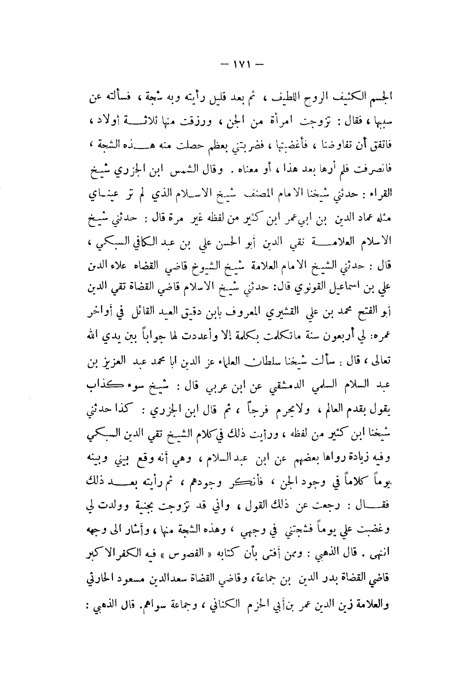 الْجِسْم الكثيف الرّوح اللَّطِيف ثمَّ بعد قَلِيل رَأَيْته وَبِه شجة فَسَأَلته عَن سَببهَا فَقَالَ تزوجت امْرَأَة من الْجِنّ وَرزقت مِنْهَا ثَلَاثَة اولاد فاتفق أَن تفاوضنا فأغضبتها فضربتني بِعظم حصلت مِنْهُ هَذِه الشَّجَّة فَانْصَرَفت فَلم أرها بعد هَذَا اَوْ مَعْنَاهُ وَقَالَ الشَّمْس ابْن الْجَزرِي شيخ الْقُرَّاء حَدثنِي شَيخنَا الامام المُصَنّف شيخ الاسلام الَّذِي لم تَرَ عَيْنَايَ مثله عماد الدّين بن ابي عمر ابْن كثير من لَفظه غير مرّة قَالَ حَدثنِي شيخ الاسلام الْعَلامَة تَقِيّ الدّين ابو الْحسن عَليّ بن عبد الْكَافِي السُّبْكِيّ قَالَ حَدثنِي الشَّيْخ الامام الْعَلامَة شيخ الشُّيُوخ قَاضِي الْقُضَاة عَلَاء الدّين عَليّ بن اسماعيل القونوي قَالَ حَدثنِي شيخ الاسلام قَاضِي الْقُضَاة تَقِيّ الدّين ابو الْفَتْح مُحَمَّد بن عَليّ الْقشيرِي الْمَعْرُوف بِابْن دَقِيق الْعِيد الْقَائِل فِي أَوَاخِر عمره لي أَرْبَعُونَ سنة مَا تَكَلَّمت بِكَلِمَة الا واعددت لَهَا جَوَابا بَين يَدي الله تَعَالَى قَالَ سَأَلت شَيخنَا سُلْطَان الْعلمَاء عز الدّين ابا مُحَمَّد عبد الْعَزِيز بن عبد السَّلَام السّلمِيّ الدِّمَشْقِي عَن ابْن عَرَبِيّ قَالَ شيخ سوء كَذَّاب يَقُول بقدم الْعَالم وَلَا يحرم فرجا ثمَّ قَالَ ابْن الْجَزرِي كَذَا حَدثنِي شَيخنَا ابْن كثير من لَفظه وَرَأَيْت ذَلِك فِي كَلَام الشَّيْخ تَقِيّ الدّين السُّبْكِيّ وَفِيه زِيَادَة رَوَاهَا بَعضهم عَن ابْن عبد السَّلَام وَهِي أَنه وَقع بيني وَبَينه يَوْمًا كلَاما فِي وجود الْجِنّ فَأنْكر وجودهم ثمَّ رَأَيْته بعد ذَلِك فَقَالَ رجعت عَن ذَلِك القَوْل وَأَنِّي قد تزوجت بجنية وَولدت لي وغضبت على يَوْمًا فشجتني فِي وَجْهي وَهَذِه الشَّجَّة مِنْهَا وَأَشَارَ الى وَجهه انْتهى قَالَ الذَّهَبِيّ وَمِمَّنْ أفتى بِأَن كِتَابَة (الفصوص (فِيهِ الْكفْر الاكبر قَاضِي الْقُضَاة بدر الدّين بن جمَاعَة وقاضي الْقُضَاة سعد الدّين مَسْعُود الْحَارِثِيّ والعلامة زين الدّين عمر بن أبي الحزم الْكِنَانِي وَجَمَاعَة سواهُم قَالَ الذَّهَبِيّ