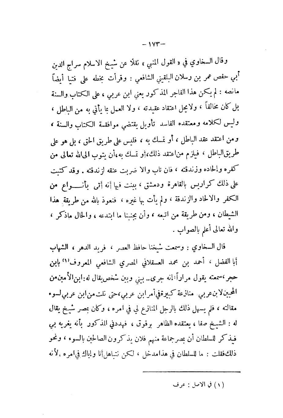 وَقَالَ السخاوي فِي (القَوْل النَّبِي (نقلا عَن شيخ الاسلام سراج الدّين أبي حَفْص عمر بن رسْلَان البُلْقِينِيّ الشَّافِعِي وقرأت بِخَطِّهِ على فتيا أَيْضا مَا نَصه لم يكن هَذَا الْفَاجِر الْمَذْكُور يَعْنِي ابْن عَرَبِيّ على الْكتاب وَالسّنة بل كَانَ مُخَالفا وَلَا يحل اعْتِقَاد عقيدته وَلَا الْعَمَل بِمَا يَأْتِي بِهِ من الْبَاطِل وَلَيْسَ كَلَامه ومعتقده الْفَاسِد تَأْوِيل يَقْتَضِي مُوَافقَة الْكتاب وَالسّنة وَمن اعْتقد عقد الْبَاطِل اَوْ تمسك بِهِ فَلَيْسَ على طَرِيق الْحق بل هُوَ على طَرِيق الْبَاطِل فَيلْزم من اعْتقد ذَلِك أَو تمسك بِهِ أَن يَتُوب الى الله تَعَالَى من كفره والحاده وزندقته فان تَابَ والا ضربت عُنُقه لزندقته وَقد كتبت على ذَلِك كراريس بِالْقَاهِرَةِ ودمشق بيّنت فِيهَا أَنه أَتَى بأنواع من الْكفْر والالحاد والزندقة وَلم يَأْتِ بهَا غَيره فنعوذ بِاللَّه من طَريقَة هَذَا الشَّيْطَان وَمن طَريقَة من اتبعهُ وَأَن يجنبنا مَا ابتدعه وَالْحَال مَا ذكر وَالله تَعَالَى أعلم بِالصَّوَابِ
