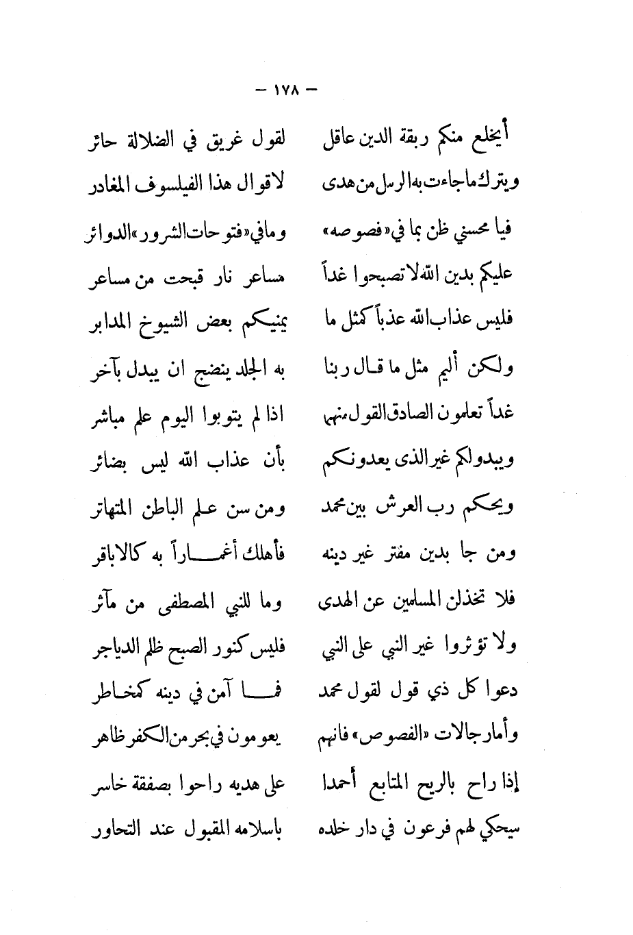 فَلَا تخذلن الْمُسلمين عَن الْهدى ... وَمَا للنَّبِي الْمُصْطَفى من مآثر ... 2 ... وَلَا تؤثروا غير النَّبِي على النَّبِي ... فَلَيْسَ كنور الصُّبْح ظلم الدياجر