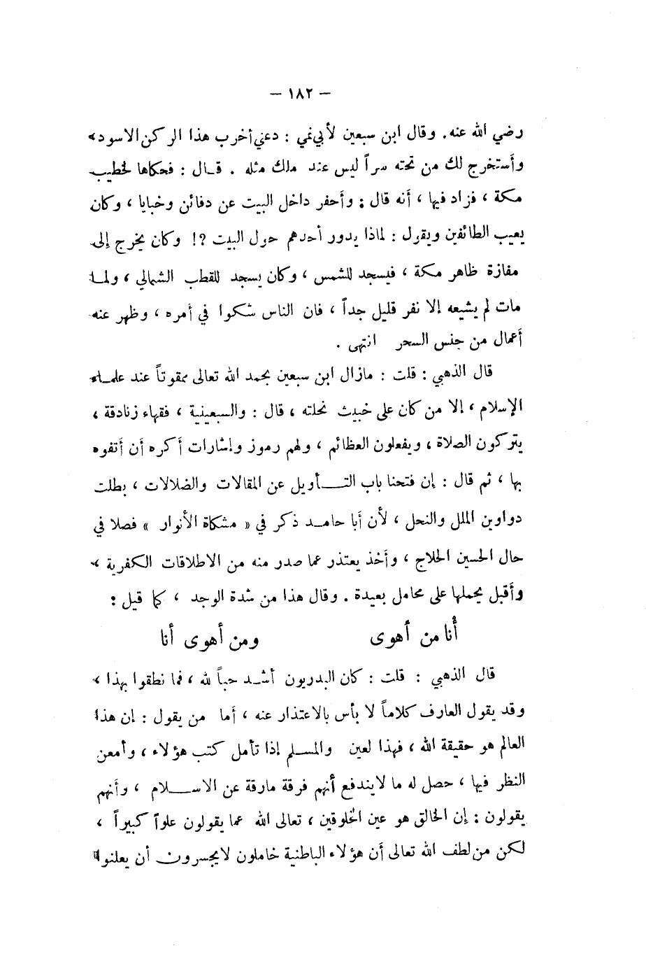 قَالَ الذَّهَبِيّ قلت مَا زَالَ ابْن سبعين بِحَمْد الله تَعَالَى ممقوتا عِنْد عُلَمَاء الْإِسْلَام إِلَّا من كَانَ على خَبِيث نحلته قَالَ والسبعينية فُقَهَاء زنادقة يتركون الصَّلَاة ويفعلون العظائم وَلَهُم رموز وإشارات أكره أَن أتفوه بهَا ثمَّ قَالَ إِن فتحنا بَاب التَّأْوِيل عَن المقالات والضلالات بطلت دواوين الْملَل والنحل لِأَن أَبَا حَامِد ذكر فِي (مشاكة الْأَنْوَار (فصلا فِي حَال الْحُسَيْن الحلاج وَأخذ يعْتَذر عَمَّا صدر مِنْهُ من الاطلاقات الكفرية وَأَقْبل يحملهَا على محامل بعيدَة وَقَالَ هَذَا من شدَّة الوجد كَمَا قيل