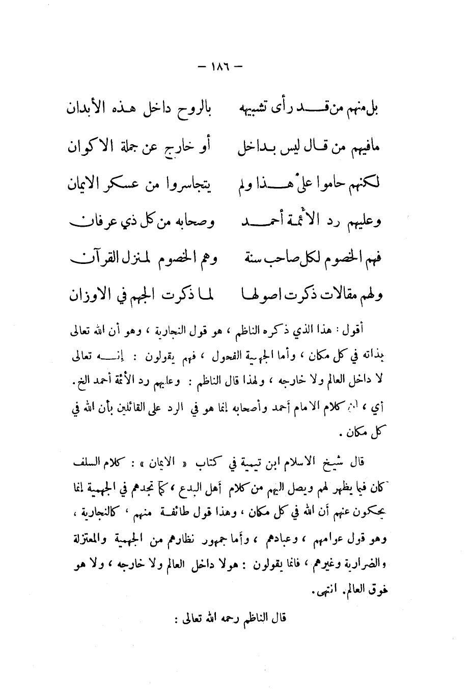 أَقُول هَذَا الَّذِي ذكره النَّاظِم هُوَ قَول النجارية وَهُوَ أَن الله تَعَالَى بِذَاتِهِ فِي كل مَكَان وَأما الْجَهْمِية الفحول فهم يَقُولُونَ إِنَّه تَعَالَى لَا دَاخل الْعَالم وَلَا خَارجه وَلِهَذَا قَالَ النَّاظِم وَعَلَيْهِم رد الْأَئِمَّة أَحْمد الخ أَي أَن كَلَام الإِمَام أَحْمد وَأَصْحَابه إِنَّمَا هُوَ فِي الرَّد على الْقَائِلين بِأَن الله فِي كل مَكَان