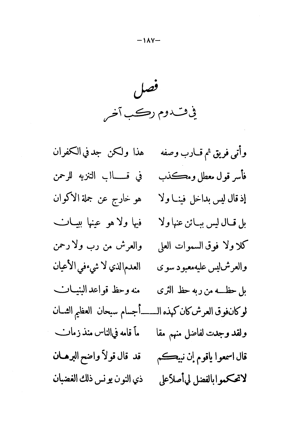فِي قالب التَّنْزِيه للرحمن ... إِذْ قَالَ لَيْسَ بداخل فِينَا وَلَا
