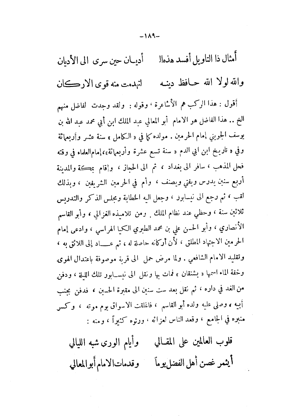 اقول هَذَا الركب هم الأشاعرة وَقَوله وَلَقَد وجدت لفاضل مِنْهُم الخ هذاالفاضل هُوَ الإِمَام أَبُو الْمَعَالِي عبد الْملك ابْن أبي مُحَمَّد عبد الله بن يُوسُف الْجُوَيْنِيّ إِمَام الْحَرَمَيْنِ مولده كَمَا فِي (الْكَامِل (سنة عشر وَأَرْبَعمِائَة وَفِي (تَارِيخ ابْن أبي الدَّم (سنة تسع عشرَة وَأَرْبَعمِائَة (إِمَام الْعلمَاء فِي وقته فَحل الْمَذْهَب سَافر إِلَى بَغْدَاد ثمَّ إِلَى الْحجاز وَأقَام بِمَكَّة وَالْمَدينَة أَربع سِنِين يدرس ويفتي ويصنف وَأم فِي الْحَرَمَيْنِ الشريفين وَبِذَلِك لقب ثمَّ رَجَعَ إِلَى نيسابور وَجعل إِلَيْهِ الخطابة ومجلس الذّكر والتدريس ثَلَاثِينَ سنة وحظي عِنْد نظام الْملك وَمن تلاميذه الغز 2 الي وَأَبُو الْقَاسِم الْأنْصَارِيّ وَأَبُو الْحسن عَليّ بن مُحَمَّد الطَّبَرِيّ الكيا الهراسي وَادّعى إِمَام الْحَرَمَيْنِ الإجتهاد الْمُطلق لِأَن أَرْكَانه حَاصِلَة لَهُ ثمَّ عَاد إِلَى اللَّائِق بِهِ وتقليد الإِمَام الشَّافِعِي وَلما مرض حمل إِلَى قَرْيَة مَوْصُوفَة باعتدال الْهوى وخفة المَاء إسمها (بشنقان (فَمَاتَ بهَا وَنقل إِلَى نيسابور تِلْكَ اللَّيْلَة وَدفن من الْغَد فِي دَاره ثمَّ نقل بعد سِتّ سِنِين إِلَى مَقْبرَة الْحُسَيْن فَدفن بِجنب أَبِيه وَصلى عَلَيْهِ وَلَده أَبُو الْقَاسِم فأغلقت ألأسواق يَوْم مَوته وَكسر منبره فِي الْجَامِع وَقعد النَّاس لعزائه ورثوه كثيرا وَمِنْه