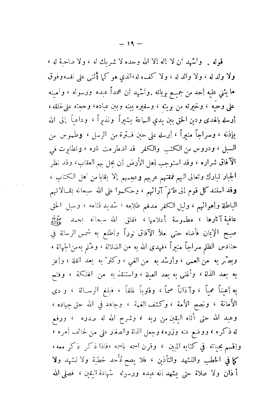 وَأشْهد أَن لَا إِلَه إِلَّا الله وَحده لَا شريك لَهُ وَلَا صَاحِبَة لَهُ وَلَا ولد لَهُ وَلَا وَالِد وَلَا كُفْء لَهُ الَّذِي هُوَ كَمَا اثنى على نَفسه وَفَوق مَا يثنى عَلَيْهِ أحد من جَمِيع برياته وَأشْهد أَن مُحَمَّدًا عَبده وَرَسُوله وأمينه على وحيه وَخيرته من بريته وسفيره بَينه وَبَين عباده وحجته على خلقه أرْسلهُ بِالْهدى وَدين الْحق بَين يَدي السباعة بشيرا وَنَذِيرا وداعيا إِلَى الله بِإِذْنِهِ وسراجا منيرا أرْسلهُ على حِين فَتْرَة من الرُّسُل وطموس من السبل ودروس من الْكتب وَالْكفْر قد اضطرمت ناره وتطايرت فِي الْآفَاق شرارة وَقد اسْتوْجبَ أهل الأَرْض أَن يحل بهم الْعقَاب وَقد نظر الْجَبَّار تبَارك وَتَعَالَى إِلَيْهِم فمقتهم عربهم وعجمهم إِلَى بقايا من أهل الْكتاب وَقد اسْتندَ كل قوم إِلَى ظلم آرائهم وحكموا على الله سُبْحَانَهُ بمقالاتهم الْبَاطِلَة وأهوائهم وليل الْكفْر مدلهم ظلامه شَدِيد قتامة وسبل الْحق عَافِيَة آثارها مطموسة أعلامها ففلق الله سُبْحَانَهُ بِمُحَمد صلى اله عَلَيْهِ وَسلم صبح الْإِيمَان فأضاء حَتَّى مَلأ الْآفَاق نورا وأطلع بِهِ شمس الرسَالَة فِي حنادس الظُّلم سِرَاجًا منيرا فهدى الله بِهِ من الضَّلَالَة وَعلم بِهِ من الْجَهَالَة وبصر بِهِ المعمى وأرشد بِهِ من الغي وَكثر بِهِ بعد الْقلَّة وأعز بِهِ بعد الذلة وأغنى بِهِ بعد الْعيلَة واستنقد بِهِ بعد الهلكة وَفتح بِهِ أعينا عميا وآذانا صمًّا وَقُلُوبًا غلقا فَبلغ الرسَالَة ودى وَأدّى الْأَمَانَة ونصح الْأمة وكشف الْغُمَّة وجاهد فِي الله حق جهاده وَعبد الله حَتَّى أَتَاهُ الْيَقِين من ربه وَشرح الله لَهُ صَدره وَرفع لَهُ ذكره وَوضع عَنهُ وزره وَجعل الذلة وَالصغَار على من خَالف أمره وَأقسم بحياته فِي كِتَابه الْمُبين وَقرن اسْمه باسمه فَإِذا ذكر ذكر مَعَه كَمَا فِي الْخطب وَالتَّشَهُّد والتأذين فَلَا يَصح لأحد خطْبَة وَلَا تشهد وَلَا أَذَان وَلَا صَلَاة حَتَّى يشْهد أَنه عَبده وَرَسُوله شَهَادَة الْيَقِين فصلى الله