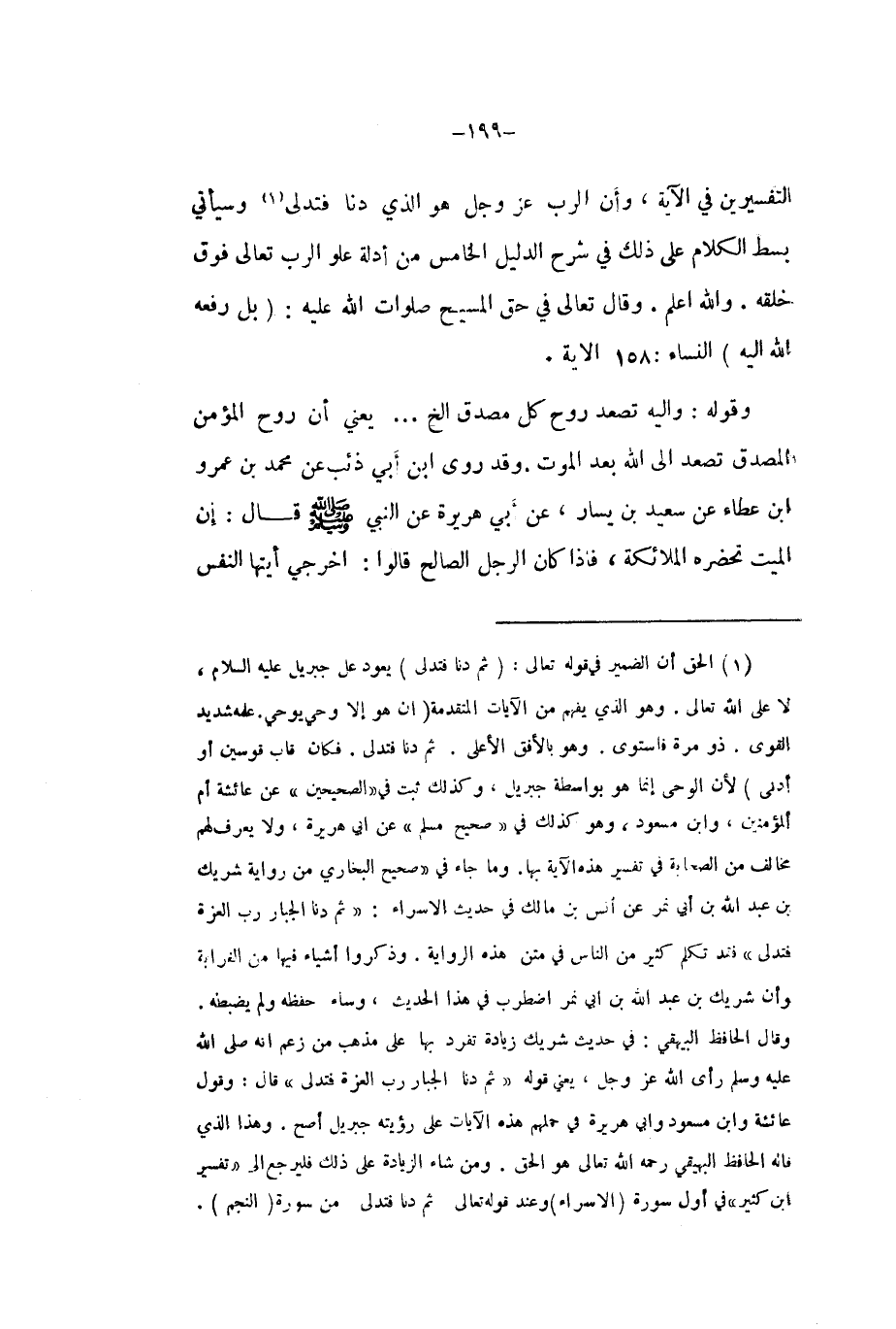 التفسيرين فِي الْآيَة وَأَن الرب عز وَجل هُوَ الَّذِي دنا فَتَدَلَّى وَسَيَأْتِي بسط الْكَلَام على ذَلِك فِي شرح الدَّلِيل الْخَامِس من أَدِلَّة علو الرب تَعَالَى فَوق خلقه وَالله اعْلَم وَقَالَ تَعَالَى فِي حق الْمَسِيح صلوَات الله عَلَيْهِ {بل رَفعه الله إِلَيْهِ} النِّسَاء 158 الْآيَة