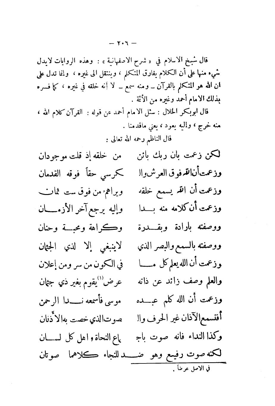 قَالَ شيخ الاسلام فِي (شرح الاصفهانية (وَهَذِه الرِّوَايَات لَا يدل شيءمنها على أَن الْكَلَام يُفَارق الْمُتَكَلّم وينتقل الى غَيره وَإِنَّمَا تدل على ان الله هُوَ الْمُتَكَلّم بِالْقُرْآنِ وَمِنْه سمع لَا أَنه خلقه فِي غَيره كَمَا فسره بذلك الامام أَحْمد وَغَيره من الائمة