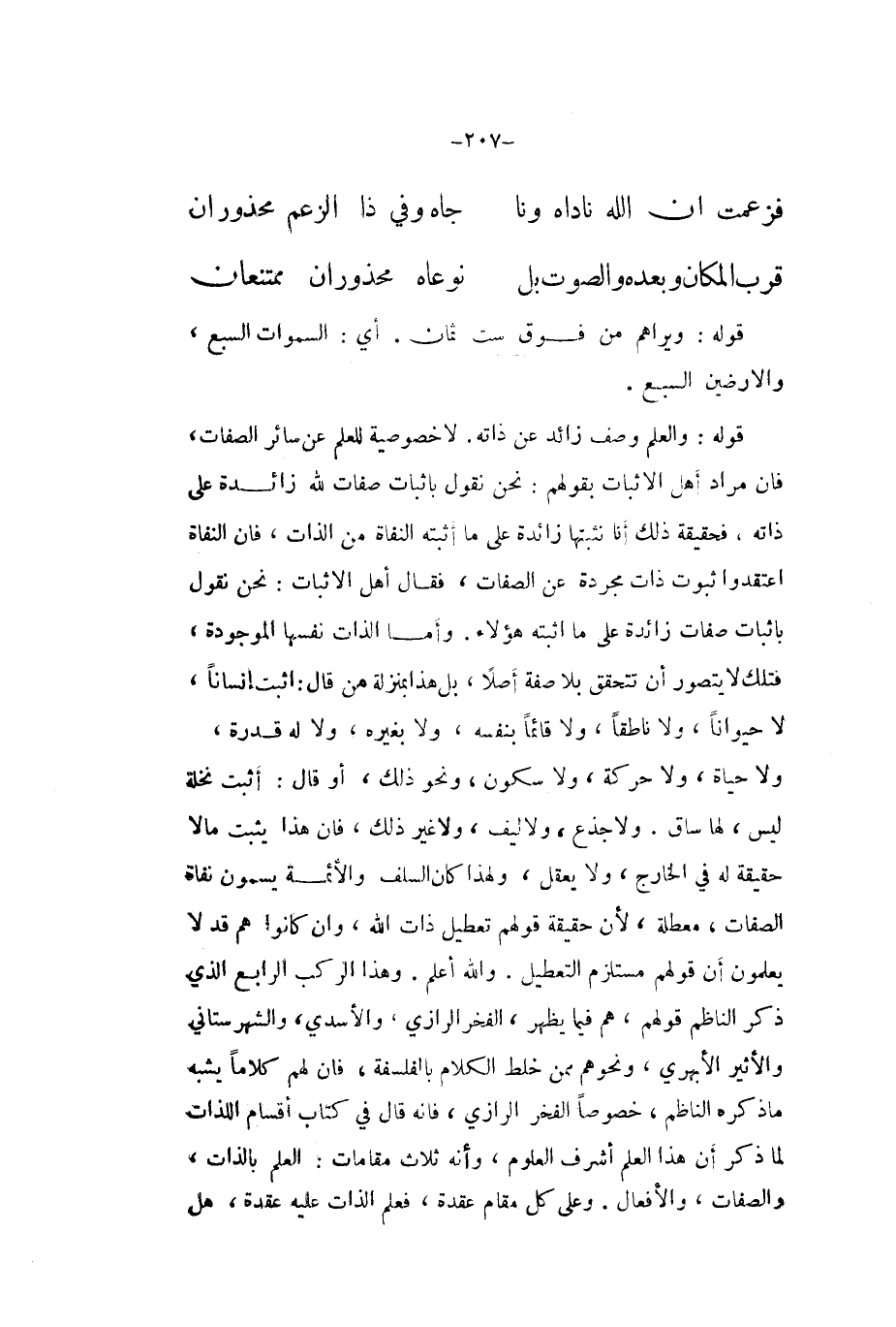قَوْله وَالْعلم وصف زَائِد عَن ذَاته لَا خُصُوصِيَّة للْعلم عَن سَائِر الصِّفَات فان مُرَاد أهل الاثبات بقَوْلهمْ نَحن نقُول باثبات صِفَات لله زَائِدَة على ذَاته فحقيقة ذَلِك أَنا نثبتها زَائِدَة على مَا أثْبته النفاة من الذَّات فان النفاة اعتقدوا ثُبُوت ذَات مُجَرّدَة عَن الصِّفَات فَقَالَ أهل الاثبات نَحن نقُول باثبات صِفَات زَائِدَة على مَا اثبته هَؤُلَاءِ وَأما الذَّات نَفسهَا الْمَوْجُودَة فَتلك لَا يتَصَوَّر أَن تتَحَقَّق بِلَا صفة أصلا بل هَذَا بِمَنْزِلَة من قَالَ اثْبتْ إنْسَانا لَا حَيَوَانا وَلَا ناطقا وَلَا قَائِما بِنَفسِهِ وَلَا بِغَيْرِهِ وَلَا لَهُ قدرَة وَلَا حَيَاة وَلَا حَرَكَة وَلَا سُكُون وَنَحْو ذَلِك أَو قَالَ أثبت نَخْلَة لَيْسَ لَهَا سَاق وَلَا جذع وَلَا لِيف وَلَا غير ذَلِك فان هَذَا يثبت مَالا حَقِيقَة لَهُ فِي الْخَارِج وَلَا يعقل وَلِهَذَا كَانَ السّلف والائمة يسمون نفاة الصِّفَات معطلة لَان حَقِيقَة قَوْلهم تَعْطِيل ذَات الله وان كَانُوا هم قد لَا يعلمُونَ ان قَوْلهم مُسْتَلْزم التعطيل وَالله أعلم وَهَذَا الركب الرَّابِع الَّذِي ذكر النَّاظِم قَوْلهم هُوَ فِيمَا يظْهر الْفَخر الرَّازِيّ والاسدي والشهر ستاني والاثير الابهري وَنَحْوهم مِمَّن خلط الْكَلَام بالفلسفة فان لَهُم كلَاما يشبه مَا ذكره النَّاظِم خُصُوصا الْفَخر الرَّازِيّ فانه قَالَ فِي كتاب اقسام اللَّذَّات لما ذكر ان هَذَا الْعلم أشرف الْعُلُوم وَأَنه ثَلَاث مقامات الْعلم بِالذَّاتِ وَالصِّفَات والافعال وعَلى كل مقَام عقدَة فَعلم الذَّات عَلَيْهِ عقدَة هَل