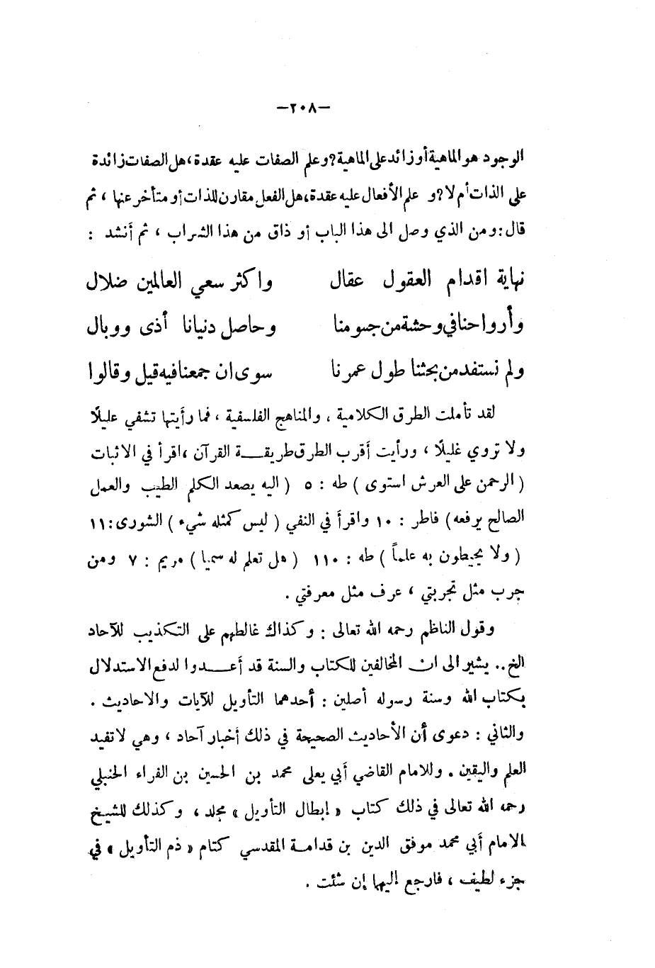 لقد تَأَمَّلت الطّرق الكلامية والمناهج الفلسفية فَمَا رَأَيْتهَا تشفي عليلا وَلَا تروي غليلا وَرَأَيْت أقرب الطّرق طَريقَة الْقُرْآن اقْرَأ فِي الاثبات {الرَّحْمَن على الْعَرْش اسْتَوَى} طه 5 {إِلَيْهِ يصعد الْكَلم الطّيب وَالْعَمَل الصَّالح يرفعهُ} فاطر 10 واقرأ فِي النَّفْي {لَيْسَ كمثله شَيْء} الشورى 11 {وَلَا يحيطون بِهِ علما} طه 110 {هَل تعلم لَهُ سميا} مَرْيَم 7 وَمن جرب مثل تجربتي عرف مثل معرفتي