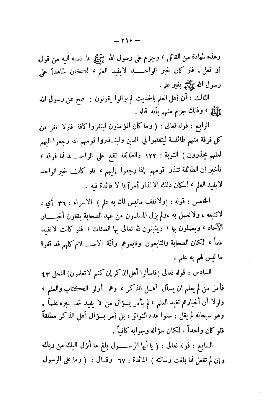 الرَّابِع قَوْله تَعَالَى {وَمَا كَانَ الْمُؤْمِنُونَ لينفروا كَافَّة فلولا نفر من كل فرقة مِنْهُم طَائِفَة ليتفقهوا فِي الدّين ولينذروا قَومهمْ إِذا رجعُوا إِلَيْهِم لَعَلَّهُم يحذرون} التَّوْبَة 122 والطائفة تقع على الْوَاحِد فَمَا فَوْقه فَأخْبر أَن الطَّائِفَة تنذر قَومهمْ إِذا رجعُوا إِلَيْهِم فَلَو كَانَ خبر الْوَاحِد لَا يُفِيد الْعلم لَكَانَ ذَلِك الانذار أمرا بِمَا لَا فَائِدَة فِيهِ