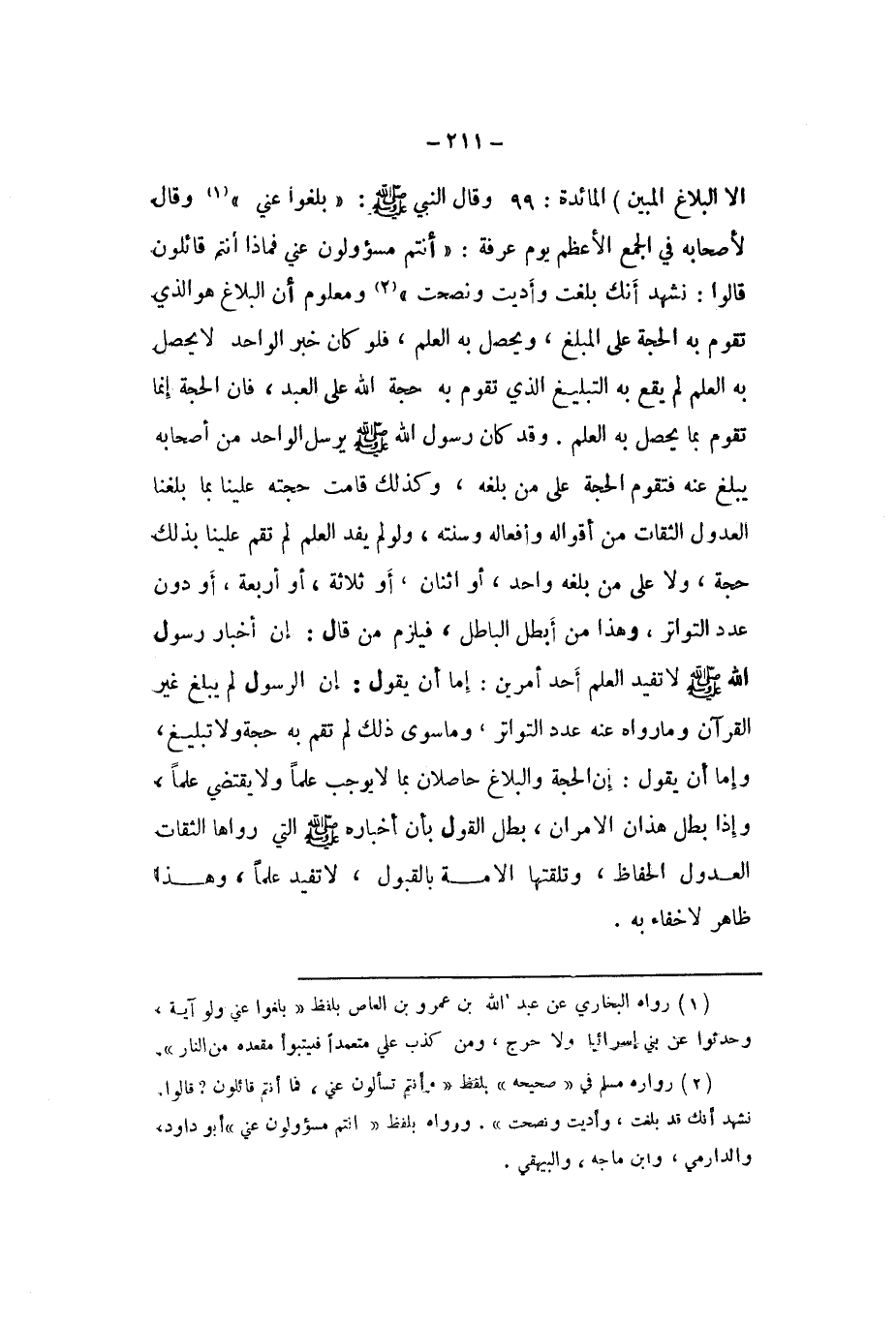 الْمَائِدَة 99 وَقَالَ النَّبِي صلى الله عَلَيْهِ وَسلم (بلغُوا عني (وَقَالَ لاصحابه فِي الْجمع الاعظم يَوْم عَرَفَة (أَنْتُم مسؤولون عني فَمَاذَا أَنْتُم قَائِلُونَ قَالُوا نشْهد أَنَّك بلغت وَأديت وَنَصَحْت (وَمَعْلُوم أَن الْبَلَاغ هُوَ الَّذِي تقوم بِهِ الْحجَّة على الْمبلغ وَيحصل بِهِ الْعلم فَلَو كَانَ خبر الْوَاحِد لَا يحصل بِهِ الْعلم لم يَقع بِهِ التَّبْلِيغ الَّذِي تقوم بِهِ حجَّة الله على العَبْد فان الْحجَّة انما تقوم بِمَا يحصل بِهِ الْعلم وَقد كَانَ رَسُول الله صلى الله عَلَيْهِ وَسلم يُرْسل الْوَاحِد من أَصْحَابه يبلغ عَنهُ فتقوم الْحجَّة على من بلغه وَكَذَلِكَ قَامَت حجَّته علينا بِمَا بلغنَا الْعُدُول الثِّقَات من أَقْوَاله وأفعاله وسنته وَلَو لم يفد الْعلم لم تقم علينا بذلك حجَّة وَلَا على من بلغه وَاحِد اَوْ اثْنَان أَو ثَلَاثَة أَو أَرْبَعَة أَو دون عدد التَّوَاتُر وَهَذَا من أبطل الْبَاطِل فَيلْزم من قَالَ إِن أَخْبَار رَسُول الله صلى الله عَلَيْهِ وَسلم لَا تفِيد الْعلم أحد أَمريْن إِمَّا أَن يَقُول إِن الرَّسُول لم يبلغ غير الْقُرْآن وَمَا رَوَاهُ عَنهُ عدد التَّوَاتُر وَمَا سوى ذَلِك لم تقم بِهِ حجَّة وَلَا تَبْلِيغ واما أَن يَقُول إِن الْحجَّة والبلاغ حاصلان بِمَا لَا يُوجب علما وَلَا يَقْتَضِي علما واذا بَطل هَذَانِ الامران بَطل القَوْل بِأَن أخباره صلى الله عَلَيْهِ وَسلم الَّتِي رَوَاهَا الثِّقَات الْعُدُول الْحفاظ وتلقتها الامة بِالْقبُولِ لَا تفِيد علما وَهَذَا ظَاهر لاخفاء بِهِ