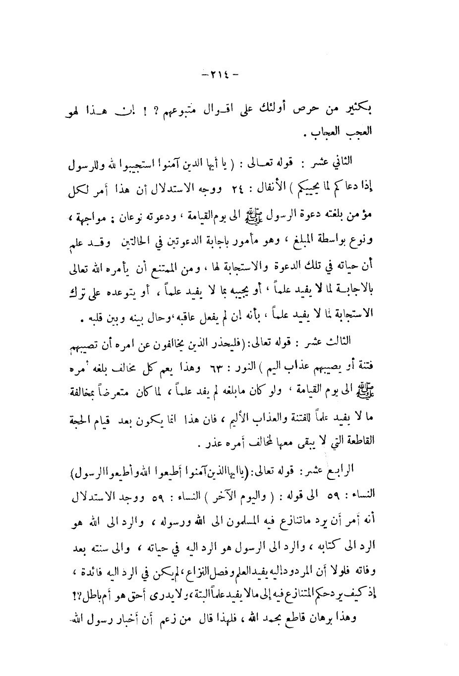 بِكَثِير من حرص أُولَئِكَ على أَقْوَال متبوعهم إِن هَذَا لَهو الْعجب العجاب الثَّانِي عشر قَوْله تَعَالَى {يَا أَيهَا الَّذين آمنُوا اسْتجِيبُوا لله وَلِلرَّسُولِ إِذا دعَاكُمْ لما يُحْيِيكُمْ} الْأَنْفَال 24 وَوجه الِاسْتِدْلَال أَن هَذَا أَمر لكل مُؤمن بلغته دَعْوَة الرَّسُول صلى الله عَلَيْهِ وَسلم إِلَى يَوْم الْقِيَامَة ودعوته نَوْعَانِ مُوَاجهَة وَنَوع بِوَاسِطَة الْمبلغ وَهُوَ مَأْمُور بإجابة الدعوتين فِي الْحَالَتَيْنِ وَقد علم أَن حَيَاته فِي تِلْكَ الدعْوَة والاستجابة لَهَا وَمن الْمُمْتَنع أَن يَأْمُرهُ الله تَعَالَى بالإجابة لما لَا يُفِيد علما أَو يجِيبه بِمَا لَا يُفِيد علما أَو يتوعد على ترك الإستجابة لما لَا يُفِيد علما بِأَنَّهُ ان لم يفعل عاقبه وَحَال بَينه وَبَين قلبه