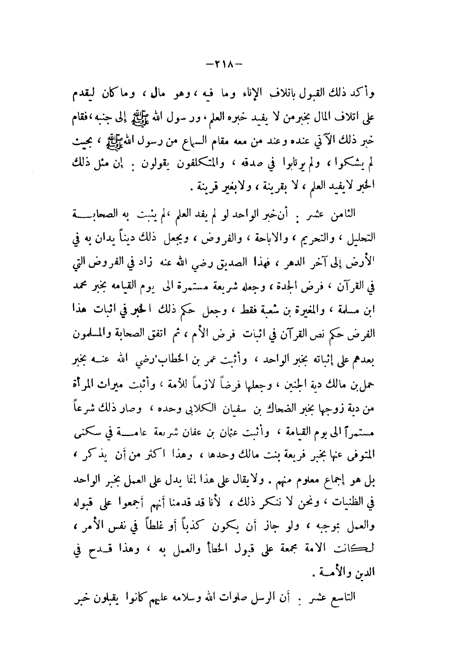 الثَّامِن عشر أَن خبر الْوَاحِد لَو لم يفد الْعلم لم يثبت بِهِ الصَّحَابَة التَّحْلِيل وَالتَّحْرِيم والاباحة والفروض وَيجْعَل ذَلِك دينا يدان بِهِ فِي الأَرْض إِلَى آخر الدَّهْر فَهَذَا الصّديق رضى الله عَنهُ زَاد فِي الْفُرُوض الَّتِي فِي الْقُرْآن فرض الْجدّة وَجعله شَرِيعَة مستمرة إِلَى يَوْم الْقِيَامَة بِخَبَر مُحَمَّد ابْن مسلمة والمغيرة بن شُعْبَة فَقَط وَجعل حكم ذَلِك الْخَبَر فِي إِثْبَات هَذَا الْفَرْض حكم نَص الْقُرْآن فِي إِثْبَات فرض الْأُم ثمَّ اتّفق الصَّحَابَة والمسلمون بعدهمْ على إثْبَاته بِخَبَر الْوَاحِد وَأثبت عمر بن الْخطاب رَضِي الله عَنهُ بِخَبَر حمل بن مَالك دِيَة الْجَنِين وَجعلهَا فرضا لَازِما للْأمة وَأثبت مِيرَاث الْمَرْأَة من دِيَة زَوجهَا بِخَبَر الضَّحَّاك بن سُفْيَان الْكلابِي وَحده وَصَارَ ذَلِك شرعا مستمرا إِ لى يَوْم الْقِيَامَة وَأثبت عُثْمَان بن عَفَّان شَرِيعَة عَامَّة فِي سُكْنى الْمُتَوفَّى عَنْهَا بِخَبَر فريعة بنت مَالك وَحدهَا وهذاأكثر من أَن يذكر بل هُوَ إِجْمَاع مَعْلُوم مِنْهُم وَلَا يُقَال على هَذَا إِنَّمَا يدل على الْعَمَل بِخَبَر الْوَاحِد فِي الظنيات وَنحن لَا ننكر ذَلِك لأَنا قد قدمنَا أَنهم أَجمعُوا على قبُوله وَالْعَمَل بِمُوجبِه وَلَو جَازَ أَن يكون كذبا أَو غَلطا فِي نفس الْأَمر لكَانَتْ الامة مجمعة على قبُول الْخَطَأ وَالْعَمَل بِهِ وَهَذَا قدح فِي الدّين وَالْأمة
