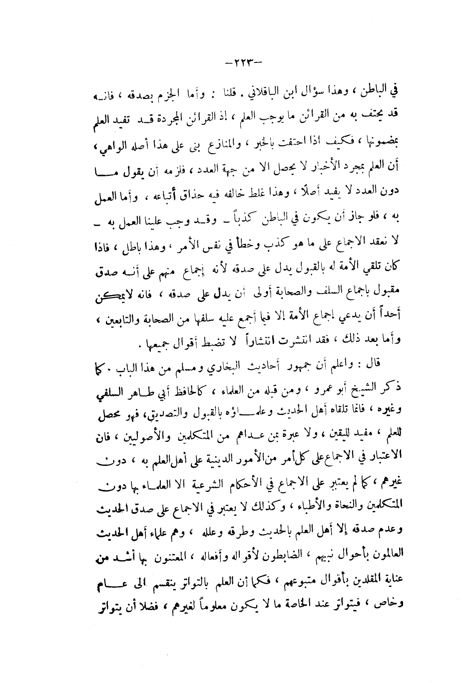 فِي الْبَاطِن وَهَذَا سُؤال ابْن الباقلاني قُلْنَا وَأما الْجَزْم بصدقه فَإِنَّهُ قد يحتف بِهِ من الْقَرَائِن مَا يُوجب الْعلم إِذْ الْقَرَائِن الْمُجَرَّدَة قد تفِيد الْعلم بمضمونها فَكيف إِذا احتفت بالْخبر والمنازع بني على هَذَا أَصله الواهي أَن الْعلم بِمُجَرَّد الْأَخْبَار لَا يحصل إِلَّا من جِهَة الْعدَد فَلَزِمَهُ ان يَقُول مَا دون الْعدَد لَا يُفِيد أصلا وَهَذَا غلط خَالفه فِيهِ حذاق أَتْبَاعه وَأما الْعَمَل بِهِ فَلَو جَازَ أَن يكون فِي الْبَاطِن كذبا وَقد وَجب علينا الْعَمَل بِهِ لَا نعقد الاجماع على مَا هُوَ كذب وَخطأ فِي نفس الْأَمر وَهَذَا بَاطِل فَإِذا كَانَ تلقي الْأمة لَهُ بِالْقبُولِ يدل على صدقه بِأَنَّهُ إِجْمَاع مِنْهُم على أَنه صدق مَقْبُول بِإِجْمَاع السّلف وَالصَّحَابَة أولى أَن يدل على صدقه فَإِنَّهُ لَا يُمكن أحد أَن يَدعِي إِجْمَاع الْأمة إِلَّا فِيمَا أجمع عَلَيْهِ سلفها من الصَّحَابَة وَالتَّابِعِينَ وَأما بعد ذَلِك فقد انتشرت انتشارا لَا 2 تضبط أَقْوَال جَمِيعهَا