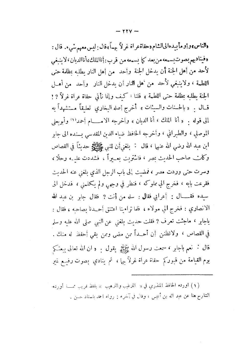 (النَّاس (وأو مأبيده الى الشَّام (حُفَاة عُرَاة غرلًا بهما (قَالَ لَيْسَ مَعَهم شَيْء قَالَ (فيناديهم بِصَوْت يسمعهُ من بعد كَمَا يسمعهُ من قرب أَنا الْملك أَنا الديَّان لَا يَنْبَغِي لَاحَدَّ من أهل الْجنَّة أَن يدْخل الْجنَّة وَأحد من اهل النَّار يَطْلُبهُ بمظلمة حَتَّى اللَّطْمَة وَلَا يَنْبَغِي لَاحَدَّ من أهل النَّار أَن يدْخل النَّار وَأحد من أهل الْجنَّة يَطْلُبهُ بمظلمة حَتَّى اللَّطْمَة (قُلْنَا كَيفَ وَإِنَّمَا نأتي حُفَاة عُرَاة غرلًا قَالَ (بِالْحَسَنَاتِ والسيئات (أخرج أَصله البُخَارِيّ تَعْلِيقا مستشهدا بِهِ ألى قَوْله (أَنا الْملك أَنا الديَّان (وَأخرجه الامام أَحْمد وَأَبُو يعلي الْموصِلِي وَالطَّبَرَانِيّ واخرجه الْحَافِظ ضِيَاء الدّين الْمَقْدِسِي بِسَنَدِهِ الى جَابر ابْن عبد الله رَضِي الله عَنْهُمَا قَالَ بَلغنِي أَن للنَّبِي صلى الله عَلَيْهِ وَسلم حَدِيثا فِي الْقصاص وَكَانَ صَاحب الحَدِيث بِمصْر فاشتريت بَعِيرًا فشددت عَلَيْهِ رحلا وسرت حَتَّى وَردت مصر فمضيت الى بَاب الرجل الَّذِي بَلغنِي عَنهُ الحَدِيث فقرعت بَابه فَخرج الي مَمْلُوكه فَنظر فِي وَجْهي وَلم يكلمني فَدخل الى سَيّده فَقَالَ أَعْرَابِي فَقَالَ سَله من أَنْت فَقَالَ جَابر بن عبد الله الانصاري فَخرج الي مَوْلَاهُ فَلَمَّا تراءينا اعتنق أَحَدنَا بِصَاحِبِهِ فَقَالَ يَا جَابر مَا جِئْت تعرف فَقلت حَدِيث بَلغنِي عَن النَّبِي صلى الله عَلَيْهِ وَسلم فِي الْقصاص وَلَا تَظنن أَن احدا مِمَّن مضى وَمِمَّنْ بَقِي أحفظ لَهُ مِنْك قَالَ نعم يَا جَابر سَمِعت رَسُول الله صلى الله عَلَيْهِ وَسلم يَقُول (ان الله تَعَالَى يبعثكم يَوْم الْقِيَامَة من قبوركم حُفَاة عُرَاة غرلًا بهما ثمَّ يُنَادي بِصَوْت رفيع غير