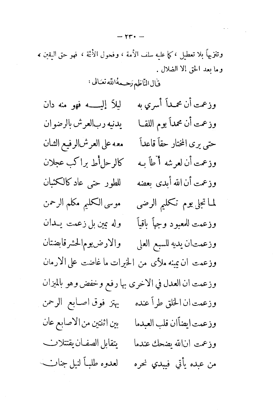 وتنزيها بِلَا تَعْطِيل كَمَا عَلَيْهِ سلف الامة وفحول الائمة فَهُوَ حق الْيَقِين وَمَا بعد الْحق الا الضلال