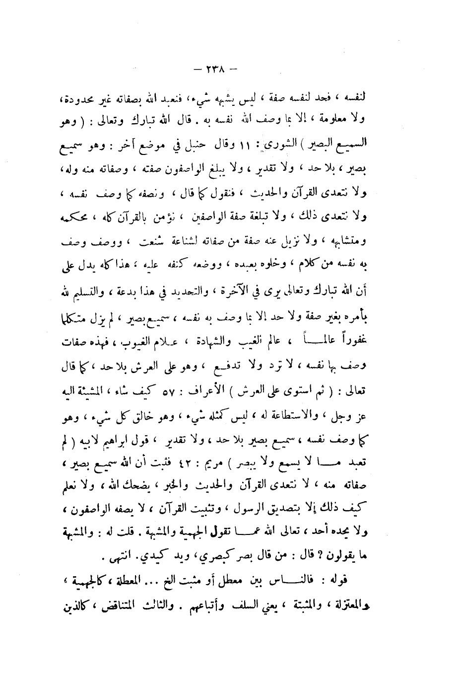لنَفسِهِ فحد لنَفسِهِ صفة لَيْسَ يُشبههُ شَيْء فنعبد الله بصفاته غير محدودة وَلَا مَعْلُومَة الا بِمَا وصف الله نَفسه بِهِ قَالَ الله تبَارك وَتَعَالَى {وَهُوَ السَّمِيع الْبَصِير} الشورى 11 وَقَالَ حَنْبَل فِي مَوضِع آخر وَهُوَ سميع بَصِير بِلَا حد وَلَا تَقْدِير وَلَا يبلغ الواصفون صفته وَصِفَاته مِنْهُ وَله وَلَا نتعدى الْقُرْآن والْحَدِيث فَنَقُول كَمَا قَالَ وَنصفه كَمَا وصف نَفسه وَلَا نتعدى ذَلِك وَلَا تبلغه صفة الواصفين نؤمن بِالْقُرْآنِ كُله محكمَة ومتشابهه وَلَا نزيل عَنهُ صفة من صِفَاته لشناعة شنعت وَوصف وصف بِهِ نَفسه من كَلَام وخلوه بِعَبْدِهِ وَوَضعه كنفه عَلَيْهِ هَذَا كُله يدل على أَن الله تبَارك وَتَعَالَى يرى فِي الاخرة والتحديد فِي هَذَا بِدعَة وَالتَّسْلِيم لله بأَمْره بِغَيْر صفة وَلَا حد إِلَّا بِمَا وصف بِهِ نَفسه سميع بَصِير لم يزل متكلما غَفُورًا علما عَالم الْغَيْب وَالشَّهَادَة علام الغيوب فَهَذِهِ صِفَات وصف بهَا نَفسه لَا ترد وَلَا تدفع وَهُوَ على الْعَرْش بِلَا حد كَمَا قَالَ تَعَالَى {ثمَّ اسْتَوَى على الْعَرْش} الاعراف 57 كَيفَ يَشَاء الْمَشِيئَة اليه عز وَجل والاستطاعة لَهُ لَيْسَ كمثله شَيْء وَهُوَ خَالق كل شَيْء وَهُوَ كَمَا وصف نَفسه سميع بَصِير بِلَا حد وَلَا تَقْدِير قَول ابراهيم لِأَبِيهِ {لم تعبد مَا لَا يسمع وَلَا يبصر} مَرْيَم 42 فَثَبت أَن الله سميع بَصِير صِفَاته مِنْهُ لَا نتعدى الْقُرْآن والْحَدِيث وَالْخَبَر يضْحك الله وَلَا نعلم كَيفَ ذَلِك إِلَّا بِتَصْدِيق الرَّسُول وتثبيت الْقُرْآن لَا يصفه الواصفون وَلَا يحده أحد تَعَالَى الله عَمَّا تَقول الْجَهْمِية والمشبهة قلت لَهُ والمشبه مَا يَقُولُونَ قَالَ من قَالَ بصر كبصري وَيَد كيدي انْتهى
