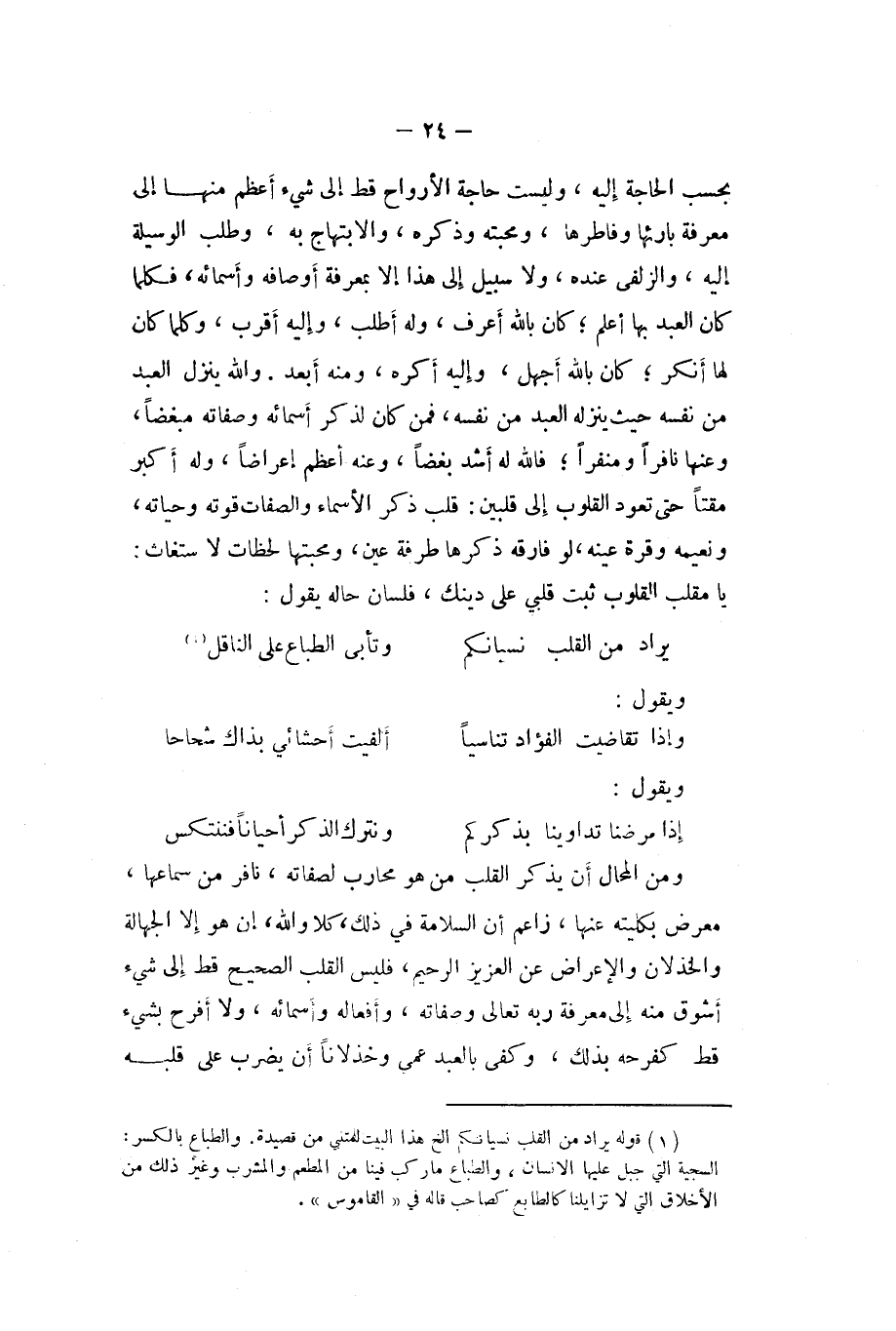 بِحَسب الْحَاجة أليه وَلَيْسَت حَاجَة الارواح قطّ الى شَيْء أعظم مِنْهَا إِلَى معرفَة بارئها وفاطرها ومحبته وَذكره والابتهاج بِهِ وَطلب الْوَسِيلَة إِلَيْهِ والزلفى عِنْده وَلَا سَبِيل إِلَى هَذَا إِلَّا بِمَعْرِِفَة أَوْصَافه وأسمائه فَكلما كَانَ العَبْد بهَا أعلم كَانَ بِاللَّه اعرف وَله أطلب وَإِلَيْهِ أقرب وَكلما كَانَ لَهَا أنكر كَانَ بِاللَّه أَجْهَل وَإِلَيْهِ أكره وَمِنْه أبعد وَالله ينزل العَبْد من نَفسه حَيْثُ ينزله العَبْد من نَفسه فَمن كَانَ لذكر أَسْمَائِهِ وَصِفَاته مبغضا وعنها نافرا ومنفرا فا لله لَهُ أَشد بغضا وَعنهُ أعظم إعْرَاضًا وَله أكبر مقتا حَتَّى تعود الْقُلُوب إِلَى قلبين قلب ذكر الاسماء وَالصِّفَات قوته وحياته ونعيمه وقرة عينه لَو فَارقه ذكرهَا طرفَة عين ومحبتها لحظات لاستغاث يَا مُقَلِّب الْقُلُوب ثَبت قلبِي على دينك فلسان حَاله يَقُول
