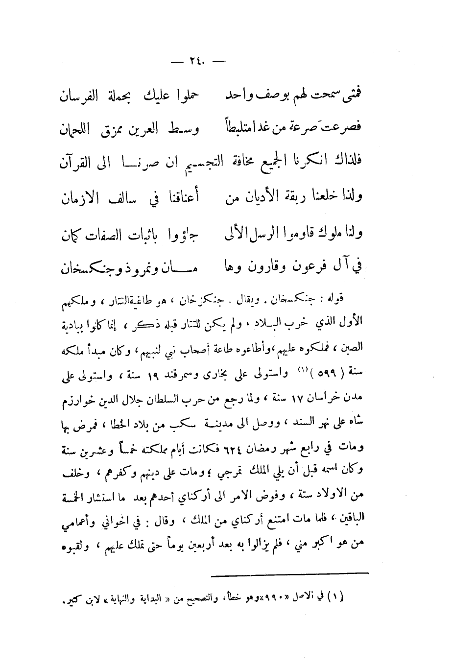 قَوْله جنكسخان وَيُقَال جنكزخان هُوَ طاغية التتار وملكهم الاول الَّذِي خرب الْبِلَاد وَلم يكن للتتار قبله ذكر انما كَانُوا ببادية الصين فملكوه عَلَيْهِم واطاعوه طَاعَة أَصْحَاب نَبِي لنبيهم وَكَانَ مبدأ ملكه سنة (599) وَاسْتولى على بُخَارى وسمرقند 19 سنة وَاسْتولى على مدن خُرَاسَان 17 سنة وَلما رَجَعَ من حَرْب السُّلْطَان جلال الدّين خوارزم شاه على نهر السَّنَد وَوصل الى مَدِينَة مكب من بِلَاد الخطا فَمَرض بهَا وَمَات فِي رَابِع شهر رَمَضَان 624 فَكَانَت أَيَّام مَمْلَكَته خمْسا وَعشْرين سنة وَكَانَ اسْمه قبل أَن يَلِي الْملك تمرجي وَمَات على دينهم وكفرهم وَخلف من الاولاد سِتَّة وفوض الامر الى اركناي أحدهم بعد مَا اسْتَشَارَ الْخَمْسَة البَاقِينَ فَلَمَّا مَاتَ امْتنع أركناي من الْملك وَقَالَ فِي اخواني وأعمامي من هُوَ اكبر مني فَلم يزَالُوا بِهِ بعد أَرْبَعِينَ يَوْمًا حَتَّى تملك عَلَيْهِم ولقبوه