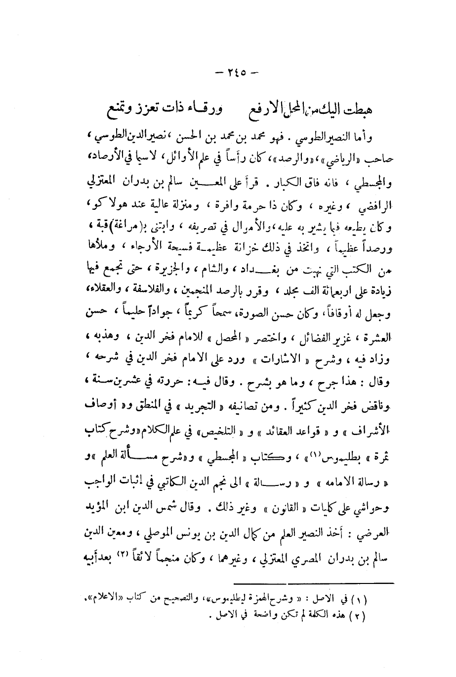وَأما النصير الطوسي فَهُوَ مُحَمَّد بن مُحَمَّد بن الْحسن نصير الدّين الطوسي صَاحب (الرياضي ((والرصد (كَانَ رَأْسا فِي علم الْأَوَائِل لَا سِيمَا فِي الأرصاد والمجسطي فَإِنَّهُ فاق الْكِبَار قَرَأَ على الْمعِين سَالم بن بدران المعتزلي الرافضي وَغَيره وَكَانَ ذَا حُرْمَة وافرة ومنزلة عالية عِنْد هولاكو وَكَانَ يطيعه فِيمَا يُشِير بِهِ عَلَيْهِ وَالْأَمْوَال فِي تصريفه وابتنى ب (مراغة) قبَّة ورصدا عَظِيما وَاتخذ فِي ذَلِك خزانَة عَظِيمَة فسيحة الأرجاء وملأها من الْكتب الَّتِي نهبت من بَغْدَاد وَالشَّام والجزيرة حَتَّى تجمع فِيهَا زِيَادَة على أَرْبَعمِائَة ألف مُجَلد وَقرر بالرصد المنجمين والفلاسفة والعقلاء وَجعل لَهُ أوقافا وَكَانَ حسن الصُّورَة سَمحا كَرِيمًا جوادا حَلِيمًا حسن الْعشْرَة غزير الْفَضَائِل وَاخْتصرَ (المحصل (للْإِمَام فَخر الدّين وهذبه وَزَاد فِيهِ وَشرح (الاشارات (ورد على الإِمَام فَخر الدّين فِي شَرحه وَقَالَ هَذَا جرح وَمَا هُوَ بشرح وَقَالَ فِيهِ حررته فِي عشْرين سنة وناقض فَخر الدّين كثيرا وَمن تصانيفه (التَّجْرِيد (فِي الْمنطق و (أَوْصَاف الْأَشْرَاف (و (قَوَاعِد العقائد (و (التَّلْخِيص (فِي علم الْكَلَام (وَشرح كتاب ثَمَرَة بطليموس (وَكتاب (المجسطي (و (شرح مَسْأَلَة الْعلم (و (رِسَالَة الامامة (و (رِسَالَة (إِلَى نجم الدّين الكاتبي فِي إِثْبَات الْوَاجِب وحواشي على كليات (القانون (وَغير ذَلِك وَقَالَ شمس الدّين ابْن الْمُؤَيد العرضي أَخذ النصير كَمَال الدّين بن يُونُس الْموصِلِي ومعين الدّين سَالم بن بدران الْمصْرِيّ المعتزلي وَغَيرهمَا وَكَانَ منجما لائقا بعد أَبِيه