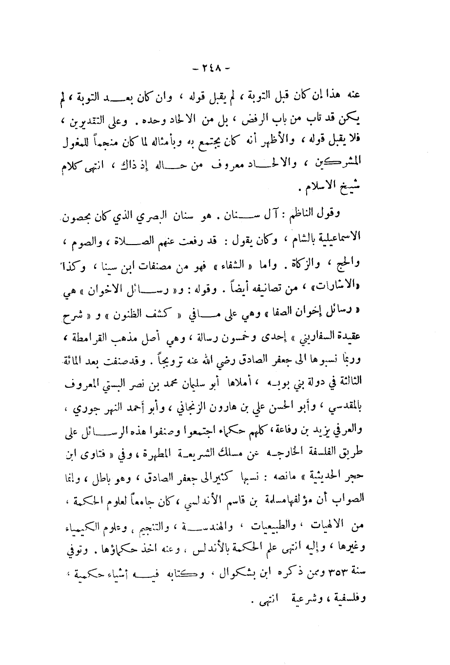 وَقَول النَّاظِم آل سِنَان هُوَ سِنَان الْبَصْرِيّ الَّذِي كَانَ بحصون الاسماعيلية بِالشَّام وَكَانَ يَقُول قد رفعت عَنْهُم الصَّلَاة وَالصَّوْم وَالْحج وَالزَّكَاة وَأما (الشِّفَاء (فَهُوَ من مصنفات ابْن سينا وَكَذَا (الإشارات (من تصانيفه أَيْضا وَقَوله و (رسائل الاخوان (هِيَ (رسائل إخْوَان الصَّفَا (وَهِي على مافي (كشف الظنون (و (شرح عقيدة السفاريني (إِحْدَى وَخَمْسُونَ رِسَالَة وَهِي أصل مَذْهَب القرامطة وَرُبمَا نسبوها إِلَى جَعْفَر الصَّادِق رَضِي الله عَنهُ ترويجا وَقد صنفت بعد الْمِائَة الثَّالِثَة فِي دولة بني بويه أملاها أَبُو سُلَيْمَان مُحَمَّد بن نصر البستي الْمَعْرُوف بالمقدسي وَأَبُو الْحسن عَليّ بن هَارُون الزنجاني وَأَبُو أَحْمد النهرجوري والعرفي يزِيد بن رِفَاعَة كلهم حكماء اجْتَمعُوا وصنفوا هَذِه الرسائل على طَرِيق الفلسفة الْخَارِجَة عَن مَسْلَك الشَّرِيعَة المطهرة وَفِي (فَتَاوَى ابْن حجر الحديثية (مَا نَصه نَسَبهَا كثير إِلَى جَعْفَر الصَّادِق وَهُوَ بَاطِل وَإِنَّمَا الصَّوَاب أَن مؤلفها مسلمة بن قَاسم الأندلسي كَانَ جَامعا لعلوم الْحِكْمَة من الالهيات والطبيعيات والهندسة والتنجيم وعلوم الكيمياء وَغَيرهَا وَإِلَيْهِ انْتهى علم الْحِكْمَة بالأندلس وَعنهُ أَخذ حكماؤها وَتُوفِّي سنة 353 وَمِمَّنْ ذكره ابْن بشكوال وَكتابه فِيهِ أَشْيَاء حكمِيَّة وفلسفية وشرعية انْتهى