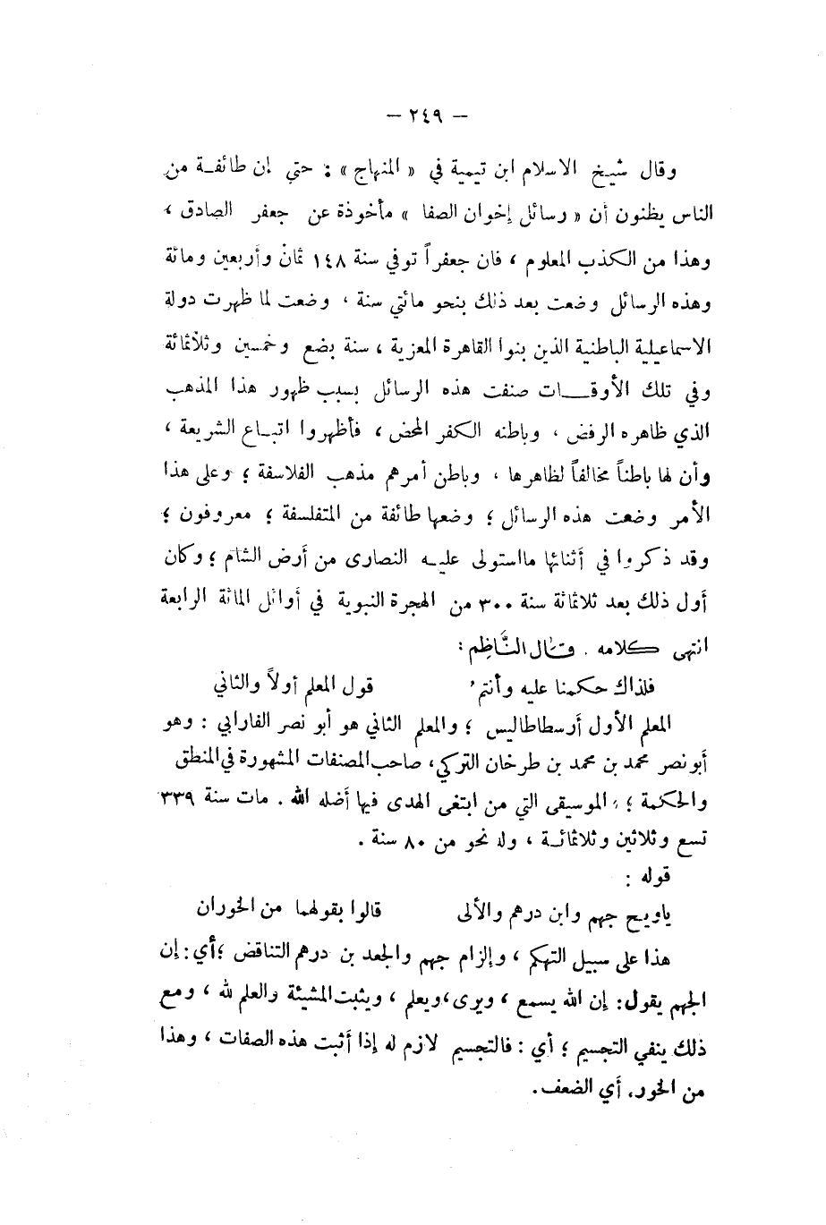 وَقَالَ شيخ الْإِسْلَام ابْن تَيْمِية فِي (الْمِنْهَاج (حَتَّى إِن طَائِفَة من النَّاس يظنون أَن (رسائل إخْوَان الصَّفَا (مَأْخُوذَة عَن جَعْفَر الصَّادِق وَهَذَا من الْكَذِب الْمَعْلُوم فَإِن جعفرا توفّي سنة 148 ثَمَان وَأَرْبَعين وَمِائَة وَهَذِه الرسائل وضعت بعد ذَلِك بِنَحْوِ مِائَتي سنة وضعت لما ظَهرت دولة الاسماعلية الباطنية الَّذين بنوا الْقَاهِرَة المعزية سنة بضع وَخمسين وثلاثمائة وَفِي تِلْكَ الْأَوْقَات صنفت هَذِه الرسائل بِسَبَب ظُهُور هَذَا الْمَذْهَب الَّذِي ظَاهره الرَّفْض وباطنه الْكفْر الْمَحْض فأظهروا اتِّبَاع الشَّرِيعَة وَأَن لَهَا بَاطِنا مُخَالفا لظاهرها وباطن أَمرهم مَذْهَب الفلاسفة وعَلى هَذَا الْأَمر وضعت هَذِه الرسائل وَضعهَا طَائِفَة من المتفلسفة معروفون وَقد ذكرُوا فِي أَثْنَائِهَا مَا استولى عَلَيْهِ النَّصَارَى من أَرض الشَّام وَكَانَ أول ذَلِك بعد ثَلَاثمِائَة سنة 300 من الْهِجْرَة النَّبَوِيَّة فِي أَوَائِل الْمِائَة الرَّابِعَة اانتهى كَلَامه قَالَ النَّاظِم