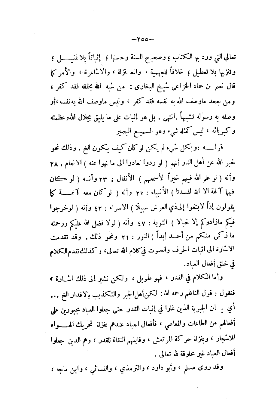 قَوْله وَبِكُل شَيْء لم يكن لَو كَانَ كَيفَ يكون الخ وَذَلِكَ نَحْو خبر الله عَن أهل النَّار انهم {وَلَو ردوا لعادوا لما نهوا عَنهُ} الانعام 28 وَأَنه {وَلَو علم الله فيهم خيرا لأسمعهم} الانفال 23 وَأَنه {لَو كَانَ فيهمَا آلِهَة إِلَّا الله لفسدتا} الانبياء 22 وَأَنه {لَو كَانَ مَعَه آلِهَة كَمَا يَقُولُونَ إِذا لابتغوا إِلَى ذِي الْعَرْش سَبِيلا} الاسراء 42 وَأَنه {لَو خَرجُوا فِيكُم مَا زادوكم إِلَّا خبالا} التَّوْبَة 47 وَأَنه {وَلَوْلَا فضل الله عَلَيْكُم وَرَحمته مَا زكى مِنْكُم من أحد أبدا} النُّور 21 وَنَحْو ذَلِك وَقد تقدّمت الاشارة الى اثبات الْحَرْف وَالصَّوْت فِي كَلَام الله تَعَالَى وَكَذَلِكَ تقدم الْكَلَام فِي خلق أَفعَال الْعباد