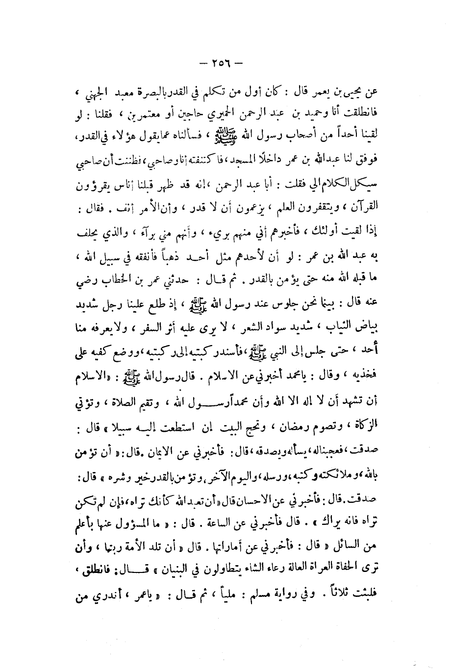 عَن يحيى بن يعمر قَالَ كَانَ أول من تكلم فِي الْقدر بِالْبَصْرَةِ معبد الْجُهَنِيّ فَانْطَلَقت انا وَحميد بن عبد الرَّحْمَن الْحِمْيَرِي حاجين اَوْ معتمرين فَقُلْنَا لَو فلقينا احدا من أَصْحَاب رَسُول الله صلى الله عَلَيْهِ وَسلم فَسَأَلْنَاهُ عَمَّا يَقُول هَؤُلَاءِ فِي الْقدر فوفق لنا عبد الله بن عمر دَاخِلا الْمَسْجِد فاكتنفته أَنا وصاحبي فَظَنَنْت أَن صَاحِبي سيكل الْكَلَام الي فَقلت ابا عبد الرَّحْمَن انه قد ظهر قبلنَا أنَاس يقرؤون الْقُرْآن ويتقفرون الْعلم يَزْعمُونَ أَن لَا قدر وَأَن الامر أنف فَقَالَ إِذا لقِيت أُولَئِكَ فاخبرهم أَنِّي مِنْهُم بَرِيء وَأَنَّهُمْ مني بُرَآء وَالَّذِي يحلف بِهِ عبد الله بن عمر لَو أَن لاحدهم مثل أحد ذَهَبا فأنفقه فِي سَبِيل الله مَا قبله الله مِنْهُ حَتَّى يُؤمن بِالْقدرِ ثمَّ قَالَ حَدثنِي عمر بن الْخطاب رَضِي الله عَنهُ قَالَ بَيْنَمَا نَحن جُلُوس عِنْد رَسُول الله صلى الله عَلَيْهِ وَسلم اذ طلع علينا رجل شَدِيد بَيَاض الثِّيَاب شَدِيد سَواد الشّعْر لَا يرى عَلَيْهِ أثر السّفر وَلَا يعرفهُ منا أحد حَتَّى جلس الى النَّبِي صلى الله عَلَيْهِ وَسلم فأسند رُكْبَتَيْهِ الى رُكْبَتَيْهِ وَوضع كفيه على فَخذيهِ وَقَالَ يَا مُحَمَّد أَخْبرنِي عَن الاسلام قَالَ رَسُول الله صلى الله عَلَيْهِ وَسلم (الاسلام أَن تشهد أَن لَا اله الا الله وَأَن مُحَمَّدًا رَسُول الله وتقيم الصَّلَاة وتؤتي الزَّكَاة وتصوم رَمَضَان وتحج الْبَيْت أَن اسْتَطَعْت اليه سَبِيلا (قَالَ صدقت فعجبنا لَهُ يسْأَله ويصدقه قَالَ فَأَخْبرنِي عَن الايمان قَالَ (أَن تؤمن بِاللَّه وَمَلَائِكَته وَكتبه وَرُسُله وَالْيَوْم الآخر وتؤمن بِالْقدرِ خَيره وشره (قَالَ صدقت قَالَ فَأَخْبرنِي عَن الاحسان قَالَ (أَن تعبد الله كَأَنَّك ترَاهُ فَإِن لم تكن ترَاهُ فانه يراك (قَالَ فَأَخْبرنِي عَن السَّاعَة قَالَ (مَا المسؤول عَنْهَا بِأَعْلَم من السَّائِل (قَالَ فَأَخْبرنِي عَن أماراتها قَالَ (أَن تَلد الامة ربتها وَأَن ترى الحفاة العراة العالة رعاء الشَّاء بتطاولون فِي الْبُنيان (قَالَ فَانْطَلق فَلَبثت ثَلَاثًا وَفِي رِوَايَة مُسلم مَلِيًّا ثمَّ قَالَ (يَا عمر أَتَدْرِي من