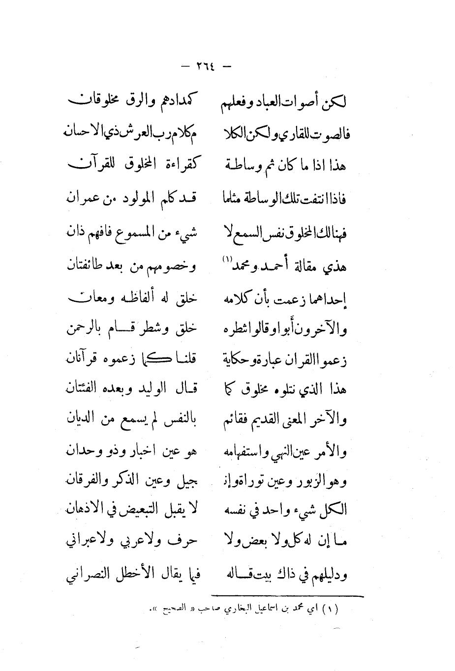 خلق وَشطر قَامَ بالرحمن ... زَعَمُوا الْقرَان عبارَة وحكاية