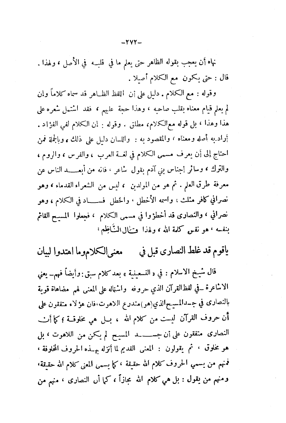 قَالَ شيخ الْإِسْلَام فِي (التسعينية (بعد كَلَام سبق وَأَيْضًا فهم يعْنى الأشاعرة فِي لفظ الْقُرْآن الَّذِي حُرُوفه واشتماله على الْمَعْنى لَهُم مضاهاة قَوِيَّة بالنصارى فِي جَسَد الْمَسِيح الَّذِي (هُوَ) متدرع اللاهوت فَإِن هَؤُلَاءِ متفقون على أَن حُرُوف الْقُرْآن لَيست من كَلَام الله بل هِيَ مخلوقة كَمَا أَن النَّصَارَى متفقون على أَن جَسَد الْمَسِيح لم يكن من اللاهوت بل هُوَ مَخْلُوق ثمَّ يَقُولُونَ الْمَعْنى الْقَدِيم لما أنزلهُ بِهَذِهِ الْحُرُوف المخلوقة فَمنهمْ من يُسَمِّي الْحُرُوف كَلَام الله حَقِيقَة كَمَا يُسَمِّي الْمَعْنى كَلَام الله حَقِيقَة وَمِنْهُم من يَقُول بل هِيَ كَلَام الله مجَازًا كَمَا أَن النَّصَارَى مِنْهُم من