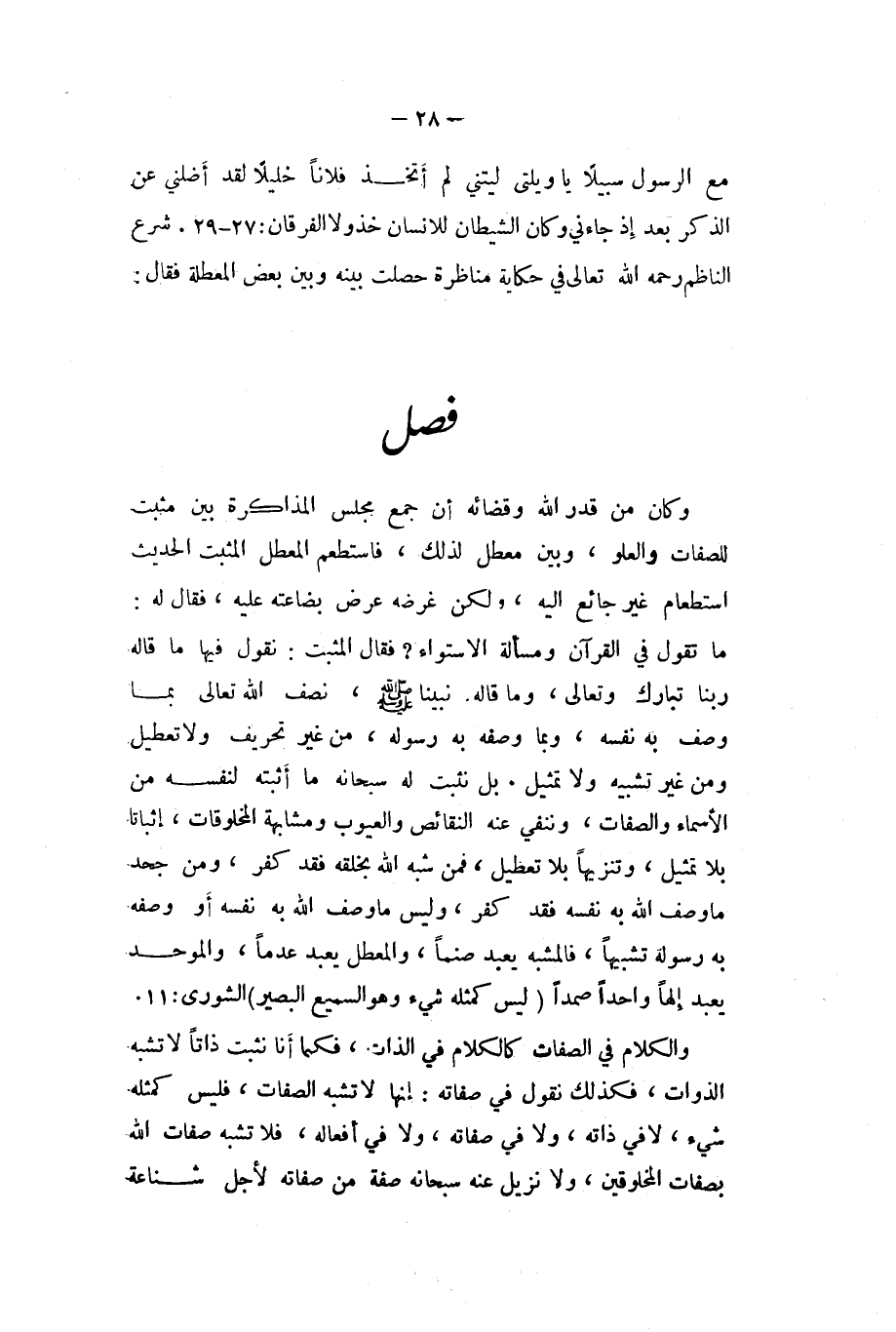 وَكَانَ من قدر الله وقضائه ان جمع مجْلِس المذاكرة بَين مُثبت للصفات والعلو وَبَين معطل لذَلِك فاستطعم الْمُعَطل الْمُثبت الحَدِيث استطعام غير جَائِع اليه وَلَكِن غَرَضه عرض بضاعته عَلَيْهِ فَقَالَ لَهُ مَا تَقول فِي الْقُرْآن وَمَسْأَلَة الاسْتوَاء فَقَالَ الْمُثبت نقُول فِيهَا مَا قَالَه رَبنَا تبَارك وَتَعَالَى وَمَا قَالَه نَبينَا صلى الله عَلَيْهِ وَسلم نصف الله تَعَالَى بِمَا وصف بِهِ نَفسه وَبِمَا وَصفه بِهِ رَسُوله من غير تَحْرِيف وَلَا تَعْطِيل وَمن غير تَشْبِيه وَلَا تَمْثِيل بل نثبت لَهُ سُبْحَانَهُ مَا أثْبته لنَفسِهِ من الاسماء وَالصِّفَات وننفي عَنهُ النقائص والعيوب ومشابهة الْمَخْلُوقَات اثباتا بِلَا تَمْثِيل وتنزيها بِلَا تَعْطِيل فَمن شبه الله بخلقه فقد كفر وَمن جحد مَا وصف الله بِهِ نَفسه فقد كفر وَلَيْسَ مَا وصف الله بِهِ نَفسه اَوْ وَصفه بِهِ رَسُولا تَشْبِيها فالمشبه يعبد صنما والمعطل يعبد عدما والموحد يعبد إِلَهًا وَاحِدًا صمدا {لَيْسَ كمثله شَيْء وَهُوَ السَّمِيع الْبَصِير} الشورى 11