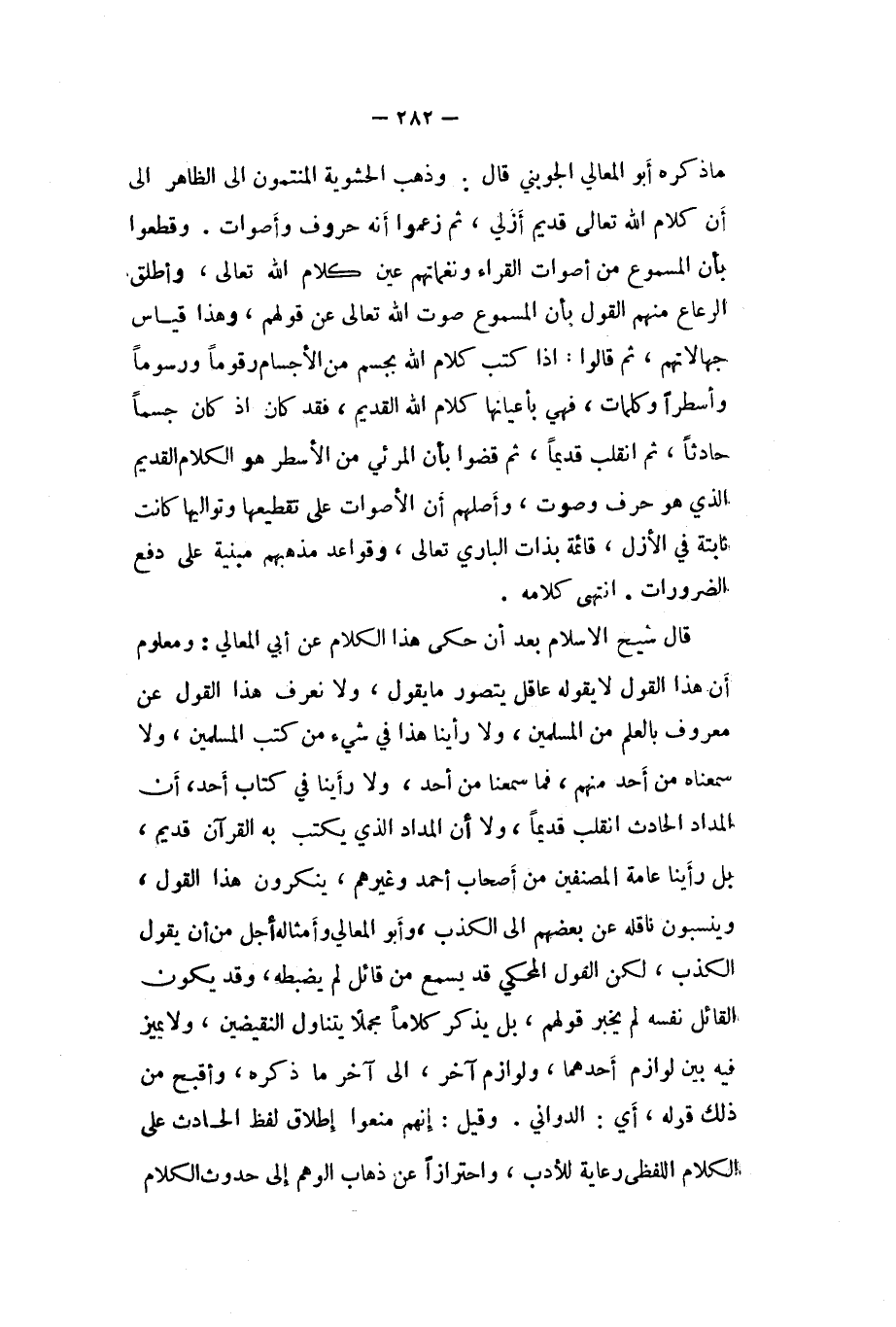 قَالَ شيخ الاسلام بعد أَن حكى هَذَا الْكَلَام عَن أبي الْمَعَالِي وَمَعْلُوم ان هَذَا القَوْل لَا يَقُوله عَاقل يتَصَوَّر مَا يَقُول وَلَا نَعْرِف هَذَا القَوْل عَن مَعْرُوف بِالْعلمِ من الْمُسلمين وَلَا رَأينَا هَذَا فِي شَيْء من كتب الْمُسلمين وَلَا سمعناه من أحد مِنْهُم فَمَا سمعنَا من اُحْدُ وَلَا رَأينَا فِي كتاب أحد أَن المداد الْحَادِث انْقَلب قَدِيما وَلَا أَن المداد الَّذِي يكْتب بِهِ الْقُرْآن قديم بل رَأينَا عَامَّة المصنفين من أَصْحَاب احْمَد وَغَيرهم يُنكرُونَ هَذَا القَوْل وينسبون ناقله عَن بَعضهم الى الْكَذِب وَأَبُو الْمَعَالِي وَأَمْثَاله أجل من أَن يَقُول الْكَذِب لَكِن القَوْل المحكي قد يسمع من قَائِل لم يضبطه وَقد يكون الْقَائِل نَفسه لم يخبر قَوْلهم بل يذكر كلَاما مُجملا يتَنَاوَل النقيضين وَلَا يُمَيّز فِيهِ بَين لَوَازِم أَحدهمَا ولوازم آخر الى آخر مَا ذكره وأقبح من ذَلِك قَوْله أَي الدواني وَقيل انهم منعُوا إِطْلَاق لفظ الْحَادِث على الْكَلَام اللَّفْظِيّ رِعَايَة للادب واحترازا عَن ذهَاب الْوَهم الى حُدُوث الْكَلَام