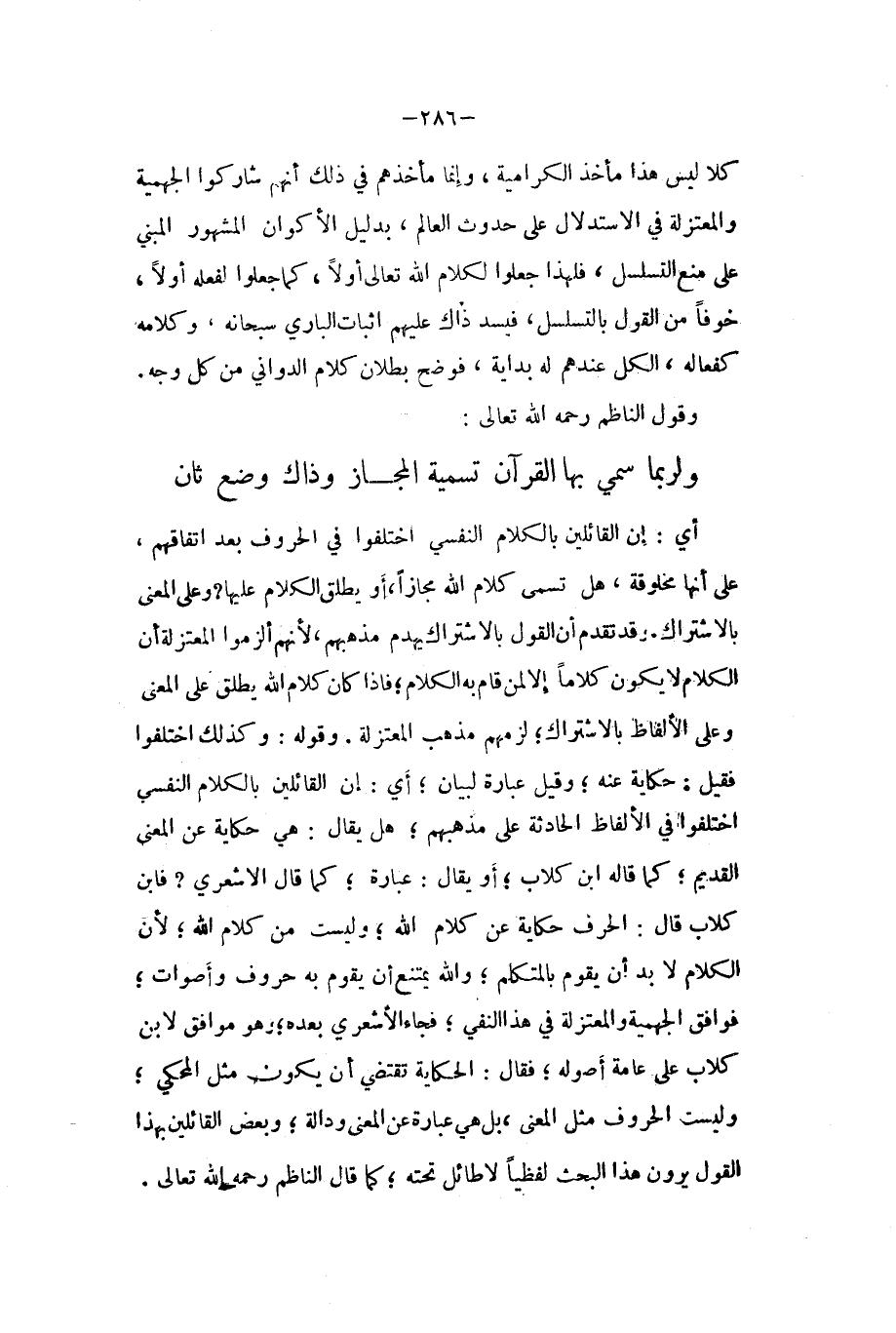 أَي إِن الْقَائِلين بالْكلَام النَّفْسِيّ اخْتلفُوا فِي الْحُرُوف بعد اتِّفَاقهم على أَنَّهَا مخلوقة هَل تسمى كَلَام الله مجَازًا أَو يُطلق الْكَلَام عَلَيْهَا وعَلى الْمَعْنى بالاشتراك وَقد تقدم أَن القَوْل بالاشتراك يهدم مَذْهَبهم لانهم ألزموا الْمُعْتَزلَة أَن الْكَلَام لَا يكون كلَاما إِلَّا لمن قَامَ بِهِ الْكَلَام فَإِذا كَانَ كَلَام الله يُطلق على الْمَعْنى وعَلى الالفاظ بالاشتراك لَزِمَهُم مَذْهَب الْمُعْتَزلَة وَقَوله وَكَذَلِكَ اخْتلفُوا فَقيل حِكَايَة عَنهُ وَقيل عبارَة لبَيَان أَي إِن الْقَائِلين بالْكلَام النَّفْسِيّ اخْتلفُوا فِي الحروب بعد اتِّفَاقهم على أَنَّهَا مخلوقة هَل تسمى كَلَام الله مجَازًا أَو يُطلق الْكَلَام عَلَيْهَا وعَلى الْمَعْنى بالإشتراك وَقد تقدم أَن القَوْل بالإشتراك يهدم مَذْهَبهم لانهم أزموا الْمُعْتَزلَة أَن الْكَلَام لَا يكون كلَاما إِلَّا لمن قَامَ بِهِ الْكَلَام فَإِذا كَانَ الْكَلَام الله يُطلق على الْمَعْنى وعَلى الْأَلْفَاظ بالإشتراك لَزِمَهُم مَذْهَب الْمُعْتَزلَة وَقَوله وَكَذَلِكَ اخْتلفُوا فَقيل حِكَايَة عَنهُ وَقيل عبارَة لبَيَان أَي إِن الْقَائِلين بالْكلَام النَّفْسِيّ اخْتلفُوا فِي الْأَلْفَاظ الْحَادِثَة على مَذْهَبهم هَل يُقَال هِيَ حِكَايَة عَن الْمَعْنى الْقَدِيم كَمَا قَالَه ابْن كلاب أَو يُقَال عبارَة كَمَا قَالَ الاشعري فَابْن كلاب قَالَ الْحَرْف حِكَايَة عَن كَلَام الله وَلَيْسَت من كَلَام الله لَان الْكَلَام لابد أَن يقوم بالمتكلم وَالله يمْتَنع أَن يقوم بِهِ حُرُوف وأصوات فَوَافَقَ الْجَهْمِية والمعتزلة فِي هَذَا النَّفْي فجَاء الاشعري بعده وَهُوَ مُوَافق لِابْنِ كلاب على عَامَّة أُصُوله فَقَالَ الْحِكَايَة تَقْتَضِي أَن يكون مثل المحكي وَلَيْسَت الْحُرُوف مثل الْمَعْنى بل هِيَ عبارَة عَن الْمَعْنى ودالة وَبَعض الْقَائِلين بِهَذَا القَوْل يرَوْنَ هَذَا الْبَحْث لفظيا لَا طائل تَحْتَهُ كَمَا قَالَ النَّاظِم رَحمَه الله تَعَالَى