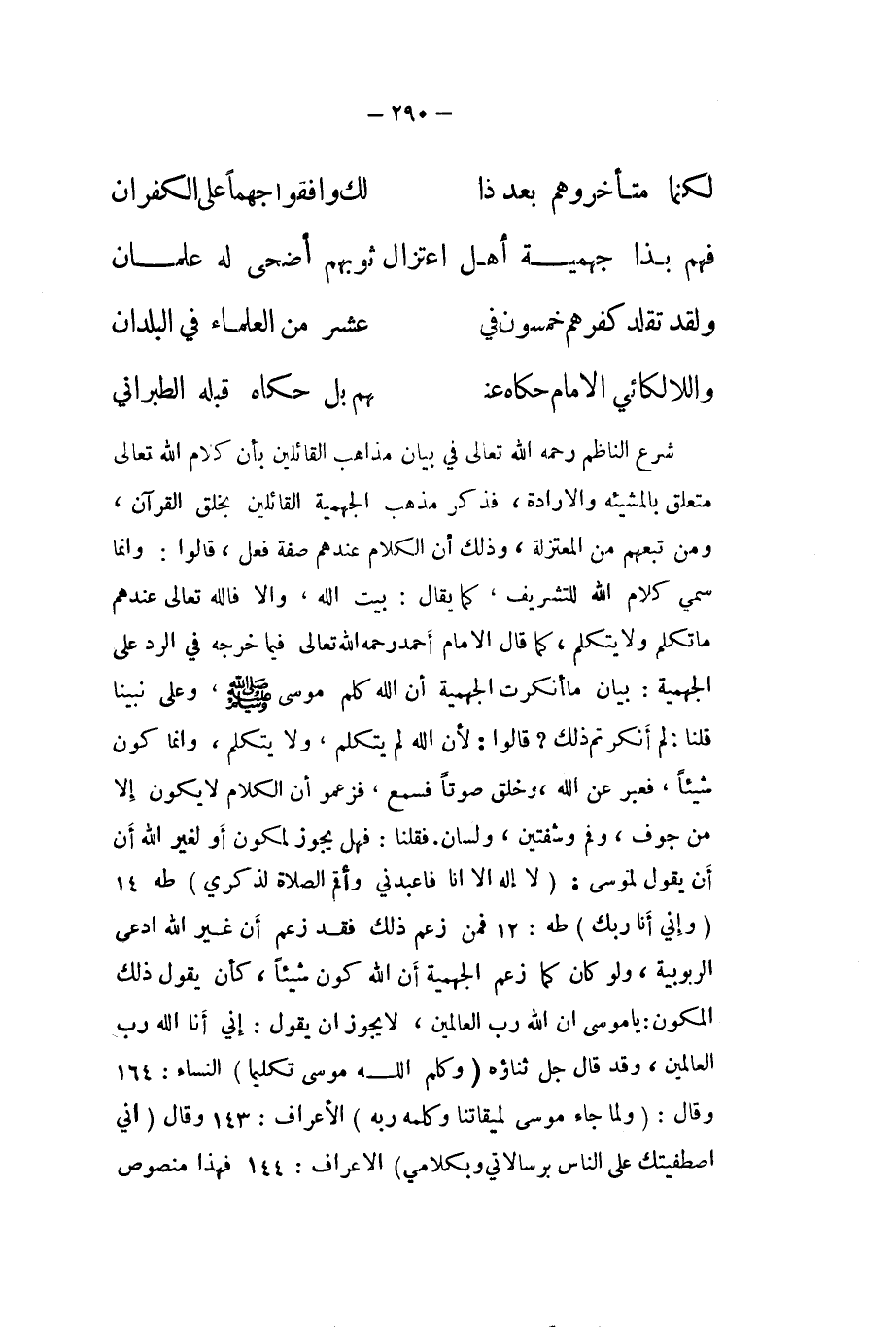 شرع النَّاظِم رَحمَه الله تَعَالَى فِي بَيَان مَذَاهِب الْقَائِلين بِأَن كَلَام الله تَعَالَى مُتَعَلق بِالْمَشِيئَةِ والارادة فَذكر مَذْهَب الْجَهْمِية الْقَائِلين بِخلق الْقُرْآن وَمن تَبِعَهُمْ من الْمُعْتَزلَة وَذَلِكَ ان الْكَلَام عِنْدهم صفة فعل قَالُوا وانما سمي كَلَام الله للتشريف كَمَا يُقَال بَيت الله والا فَالله تَعَالَى عِنْدهم مَا تكلم وَلَا يتَكَلَّم كَمَا قَالَ الامام أَحْمد رَحمَه الله تَعَالَى فِيمَا خرجه فِي الرَّد على الْجَهْمِية بَيَان مَا انكرت الْجَهْمِية ان الله كلم مُوسَى صلى الله عَلَيْهِ وَسلم وعَلى نَبينَا قُلْنَا لم أنكرتم ذَلِك قَالُوا لَان الله لم يتَكَلَّم وَلَا يتَكَلَّم وانما كَون شَيْئا فَعبر عَن الله وَخلق صَوتا فَسمع فزعمو ان الْكَلَام لَا يكون إِلَّا من جَوف وفم وشفتين ولسان فَقُلْنَا فَهَل يجوز لمكون اَوْ لغير الله أَن يَقُول لمُوسَى {لَا إِلَه إِلَّا أَنا فاعبدني وأقم الصَّلَاة لذكري} طه 14 {?} طه 12 فَمن زعم ذَلِك فقد زعم أَن غير الله ادّعى الربوبية وَلَو كَانَ كَمَا زعم الْجَهْمِية أَن الله كَون شَيْئا كَأَن يَقُول ذَلِك المكون يَا مُوسَى ان الله رب الْعَالمين لَا يجوز ان يَقُول إِنِّي أَنا الله رب الْعَالمين وَقد قَالَ جلّ ثَنَاؤُهُ {وكلم الله مُوسَى تكليما} النِّسَاء 164 وَقَالَ {وَلما جَاءَ مُوسَى لِمِيقَاتِنَا وَكَلمه ربه} الاعراف 143 وَقَالَ {إِنِّي اصطفيتك على النَّاس برسالاتي وبكلامي} الاعراف 144 فَهَذَا مَنْصُوص