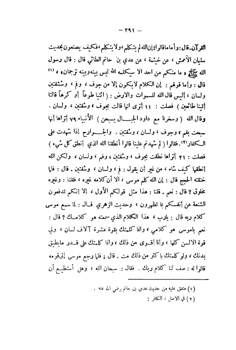الْقُرْآن قَالَ واما مَا قَالُوا ان الله لم يتَكَلَّم وَلَا يتَكَلَّم فَكيف يصنعون بِحَدِيث سُلَيْمَان الاعمش عَن خَيْثَمَة عَن عدي بن حَاتِم الطَّائِي قَالَ قَالَ رَسُول الله صلى الله عَلَيْهِ وَسلم (مَا مِنْكُم من أحد الا سيكلمه الله لَيْسَ بَينه وَبَينه ترجمان (قَالَ واما قَوْلهم إِن الْكَلَام لَا يكون إِلَّا من جَوف وفم وشفتين ولسان أَلَيْسَ قَالَ الله لِلسَّمَوَاتِ والارض {ائتيا طَوْعًا أَو كرها قَالَتَا أَتَيْنَا طائعين} فصلت 11 أَتَرَى انها قَالَت بجوف وشفتين ولسان وَقَالَ الله {وسخرنا مَعَ دَاوُد الْجبَال يسبحْنَ} الانبياء 79 أتراها أَنَّهَا سبحت بِفَم وجوف ولسان وشفتين والجوارح اذا شهِدت على الْكفَّار فَقَالُوا {لم شهدتم علينا قَالُوا أنطقنا الله الَّذِي أنطق كل شَيْء} فصلت 21 أتراها نطقت بجوف وشفتين وفم ولسان وَلَكِن الله انطقها كَيفَ شَاءَ من غير أَن يَقُول فَم ولسان وشفتين قَالَ فَلَمَّا خنقته الْحجَج قَالَ إِن الله كلم مُوسَى الا أَن كَلَامه غَيره فَقُلْنَا وَغَيره مَخْلُوق قَالَ نعم قُلْنَا هَذَا مثل قَوْلكُم الاول الا انكم تدفعون الشنعة عَن أَنفسكُم بِمَا تظْهرُونَ وَحَدِيث الزُّهْرِيّ قَالَ لما سمع مُوسَى كَلَام ربه قَالَ يَا رب هَذَا الْكَلَام الَّذِي سمعته هُوَ كلامك قَالَ نعم يَا مُوسَى هُوَ كَلَامي وانما كلمتك بِقُوَّة عشرَة آلَاف لِسَان ولي قُوَّة الالسن كلهَا وَأَنا أقوى من ذَلِك وانما كلمتك على قدر مَا يُطيق بدنك وَلَو كلمتك باكثر من ذَلِك لمت قَالَ فَلَمَّا رَجَعَ مُوسَى الى قومه قَالُوا لَهُ صف لنا كَلَام رَبك فَقَالَ سُبْحَانَ الله وَهل أَسْتَطِيع أَن