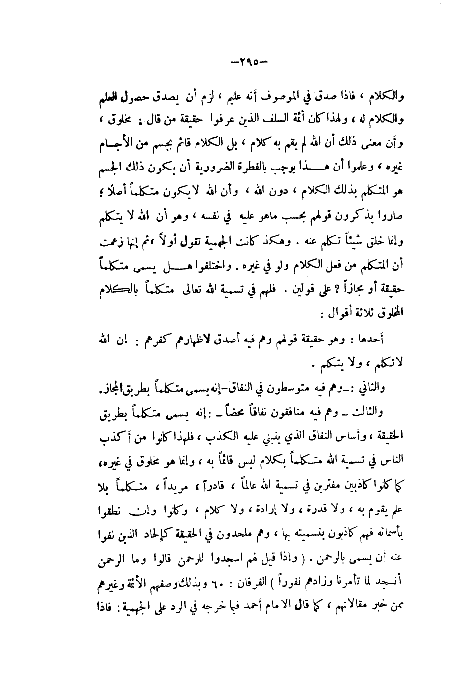 وَالْكَلَام فاذا صدق فِي الْمَوْصُوف انه عليم لزم ان يصدق حُصُول الْعلم وَالْكَلَام لَهُ وَلِهَذَا كَانَ أَئِمَّة السّلف الَّذين عرفُوا حَقِيقَة من قَالَ مَخْلُوق وان معنى ذَلِك ان الله لم يقم بِهِ كَلَام بل الْكَلَام قَائِم بجسم من الاجسام غَيره وَعَلمُوا ان هَذَا يُوجب بالفظرة الضرورية ان يكون ذَلِك الْجِسْم هُوَ الْمُتَكَلّم بذلك الْكَلَام دون الله وَأَن الله لَا يكون متكلما اصلا صَارُوا يذكرُونَ قَوْلهم بِحَسب مَا هُوَ عَلَيْهِ فِي نَفسه وَهُوَ ان الله لَا يتَكَلَّم وانما خلق شَيْئا تكلم عَنهُ هَكَذَا كَانَت الْجَهْمِية تَقول اولا ثمَّ انها زعمت ان الْمُتَكَلّم من فعل الْكَلَام وَلَو فِي غَيره وَاخْتلفُوا هَل يُسمى متكلما حَقِيقَة اَوْ مجَازًا على قَوْلَيْنِ فَلهم فِي تَسْمِيَة الله تَعَالَى متكلما بالْكلَام الْمَخْلُوق ثَلَاثَة اقوال
