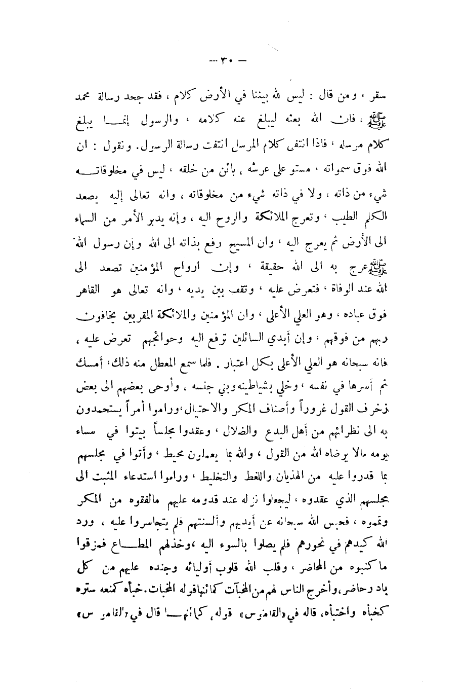 سقر وَمن قَالَ لَيْسَ لله بَيْننَا فِي الارض كَلَام فقد جحد رِسَالَة مُحَمَّد صلى الله عَلَيْهِ وَسلم فَإِن الله بَعثه ليبلغ عَنهُ كَلَامه وَالرَّسُول انما يبلغ كَلَام مرسله فاذا انْتَفَى كَلَام الْمُرْسل انْتَفَت رِسَالَة الرَّسُول ونقول ان الله فَوق سمواته مستو على عَرْشه بَائِن من خلقه لَيْسَ فِي مخلوقاته شَيْء من ذَاته وَلَا فِي ذَاته شَيْء من مخلوقاته وانه تَعَالَى اليه يصعد الْكَلم الطّيب وتعرج الْمَلَائِكَة وَالروح اليه وانه يدبر الامر من السَّمَاء الى الارض ثمَّ يعرج اليه وان الْمَسِيح رفع بِذَاتِهِ الى الله وان رَسُول الله صلى الله عَلَيْهِ وَسلم عرج بِهِ الى الله حَقِيقَة وان ارواح الْمُؤمنِينَ تصعد الى الله عِنْد الْوَفَاة فتعرض عَلَيْهِ وتقف بَين يَدَيْهِ وانه تَعَالَى هُوَ القاهر فَوق عباده وَهُوَ الْعلي الاعلى وان الْمُؤمنِينَ وَالْمَلَائِكَة المقربين يخَافُونَ رَبهم من فَوْقهم وان ايدي السَّائِلين ترفع اليه وحوائجهم تعرض عَلَيْهِ فانه سُبْحَانَهُ هُوَ الْعلي الاعلى بِكُل اعْتِبَار فَلَمَّا سمع الْمُعَطل مِنْهُ ذَلِك امسك ثمَّ اسرها فِي نَفسه وخلي بشياطينه وَبني جنسه واوحى بَعضهم الى بعض زخرف القَوْل غرُورًا واصناف الْمَكْر والاحتيال وراموا امرا يستحمدون بِهِ الى نظرائهم من اهل الْبدع والضلال وعقدوا مَجْلِسا بيتوا فِي مسَاء يَوْمه مَالا يرضاه الله من القَوْل وَالله بِمَا يعْملُونَ مُحِيط واتوا فِي مجلسهم يما قدرُوا عَلَيْهِ من الهذيان واللغط والتخليط وراموا استدعاء الْمُثبت الى مجلسهم الَّذِي عقدوه ليجعلوا نزله عِنْد قدومه عَلَيْهِم مالفقوه من الْمَكْر وتمموه فحبس الله سُبْحَانَهُ عَن ايديهم والسنتهم فَلم يتجاسروا عَلَيْهِ ورد الله كيدهم فِي نحورهم فَلم يصلوا بالسوء اليه وخذلهم المطاع فمزقوا مَا كتبوه من المحاضر وقلب الله قُلُوب أوليائه وجنده عَلَيْهِم من كل باد وحاضر واخرج النَّاس لَهُم من المخبآت كمائنها قَوْله المخبات خبأه كمنعه ستره كخبأه واختبأه قَالَه فِي (الْقَامُوس (قَوْله كمائنها قَالَ فِي (الْقَامُوس (