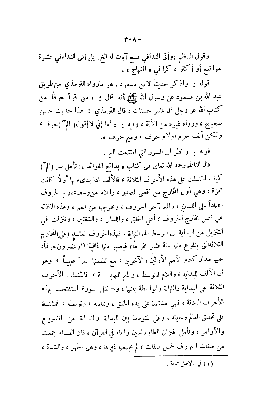 قَالَ النَّاظِم رَحمَه الله تَعَالَى فِي كتاب (بَدَائِع الْفَوَائِد (تَأمل سر (الم) كَيفَ اشْتَمَلت على هَذِه الاحرف الثَّلَاثَة فالالف اذا بدىء بهَا أَولا كَانَت همزَة وَهِي أول المخارج من أقْصَى الصَّدْر وَاللَّام من وسط مخارج الْحُرُوف اعْتِمَادًا على اللِّسَان وَالْمِيم آخر الْحُرُوف ومخرجها من الْفَم وَهَذِه الثَّلَاثَة هِيَ أصل مخارج الْحُرُوف أَعنِي الْحلق وَاللِّسَان والشفتين وتنزلت فِي التَّنْزِيل من الْبِدَايَة الى الْوسط الى النِّهَايَة فَهَذِهِ الْحُرُوف تعتمد (على) المخارج الثَّلَاثَة الَّتِي يتَفَرَّع مِنْهَا سِتَّة عشر مخرجا فَيصير مِنْهَا ثَمَانِيَة وَعِشْرُونَ حرفا عَلَيْهَا مدَار كَلَام الامم الاولين والاخرين مَعَ تظمنها سرا عجيبا وَهُوَ ان الالف للبداية وَاللَّام للتوسط وَالْمِيم للنِّهَايَة فاشتملت الاحرف الثَّلَاثَة على الْبِدَايَة وَالنِّهَايَة والواسطة بَينهمَا وكل سُورَة استفتحت بِهَذِهِ الاحرف الثَّلَاثَة فَهِيَ مُشْتَمِلَة على بَدْء الْخلق ونهايته وتوسطه فمشتملة على تخليق الْعَالم وغايته وعَلى الْمُتَوَسّط بَين الْبِدَايَة وَالنِّهَايَة من التشريع والاوامر وَتَأمل اقتران الطَّاء بِالسِّين وَالْهَاء فِي الْقُرْآن فَإِن الطَّاء جمعت من صِفَات الْحُرُوف خمس صِفَات لم يجمعها غَيرهَا وَهِي الْجَهْر والشدة