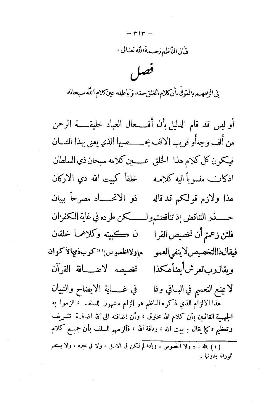هَذَا الالزام الَّذِي ذكره النَّاظِم هُوَ إِلْزَام مَشْهُور للسلف الزموا بِهِ الْجَهْمِية الْقَائِلين بِأَن كَلَام الله مَخْلُوق وَأَن إِضَافَته الى الله اضافة تشريف وتعظيم كَمَا يُقَال بَيت الله وناقة الله فألزمهم السّلف بِأَن جَمِيع كَلَام