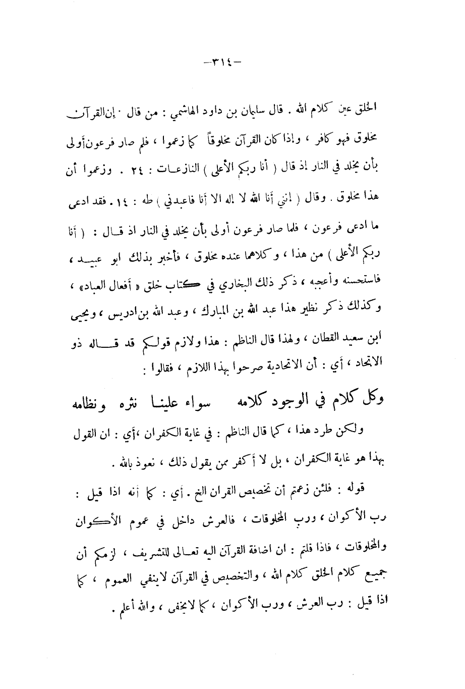 الْخلق عين كَلَام الله قَالَ سُلَيْمَان بن دَاوُد الْهَاشِمِي من قَالَ إِن الْقُرْآن مَخْلُوق فَهُوَ كَافِر واذا كَانَ الْقُرْآن مخلوقا كَمَا زَعَمُوا فَلم صَار فِرْعَوْن أولى بِأَن يخلد فِي النَّار اذ قَالَ {أَنا ربكُم الْأَعْلَى} النازعات 24 وَزَعَمُوا أَن هَذَا مَخْلُوق وَقَالَ {إِنَّنِي أَنا الله لَا إِلَه إِلَّا أَنا فاعبدني} طه 14 فقد ادّعى مَا ادّعى فِرْعَوْن فَلَمَّا صَار فِرْعَوْن اولى بِأَن يخلد فِي النَّار اذ قَالَ {أَنا ربكُم الْأَعْلَى} من هَذَا وَكِلَاهُمَا عِنْده مَخْلُوق فَأخْبر بذلك ابو عبيد فَاسْتَحْسَنَهُ وَأَعْجَبهُ ذكر ذَلِك البُخَارِيّ فِي كتاب خلق (أَفعَال الْعباد (وَكَذَلِكَ ذكر نَظِير هَذَا عبد الله بن الْمُبَارك وَعبد الله بن ادريس وَيحيى ابْن سعيد الْقطَّان وَلِهَذَا قَالَ النَّاظِم هَذَا ولازم قَوْلكُم قد قَالَه ذُو الِاتِّحَاد أَي أَن الاتحادية صَرَّحُوا بِهَذَا اللَّازِم فَقَالُوا
