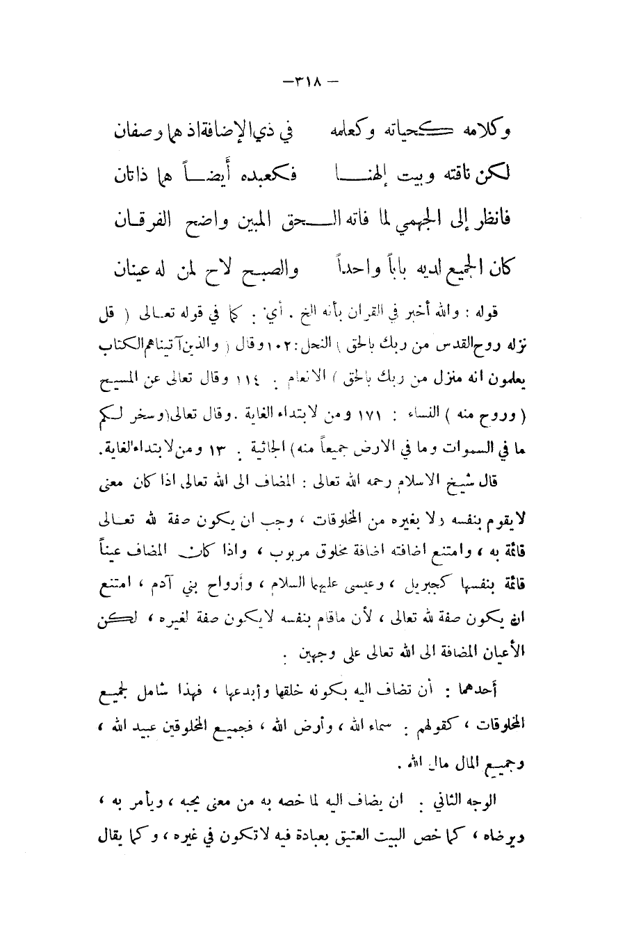 قَالَ شيخ الاسلام رَحمَه الله تَعَالَى الْمُضَاف الى الله تَعَالَى اذا كَانَ معنى لَا يقوم بِنَفسِهِ وَلَا بِغَيْرِهِ من الْمَخْلُوقَات وَجب ان يكون ضفة لله تَعَالَى قَائِمَة بِهِ وَامْتنع اضافته اضافة مَخْلُوق مربوب وَإِذا كَانَ الْمُضَاف عينا قَائِمَة بِنَفسِهَا كجبريل وَعِيسَى عَلَيْهِمَا السَّلَام وأرواح بني آدم امْتنع ان يكون صفة لله تَعَالَى لِأَن مَا قَامَ بِنَفسِهِ لَا يكون صفة لغيره لَكِن الاعيان المضافة الى الله تَعَالَى على وَجْهَيْن