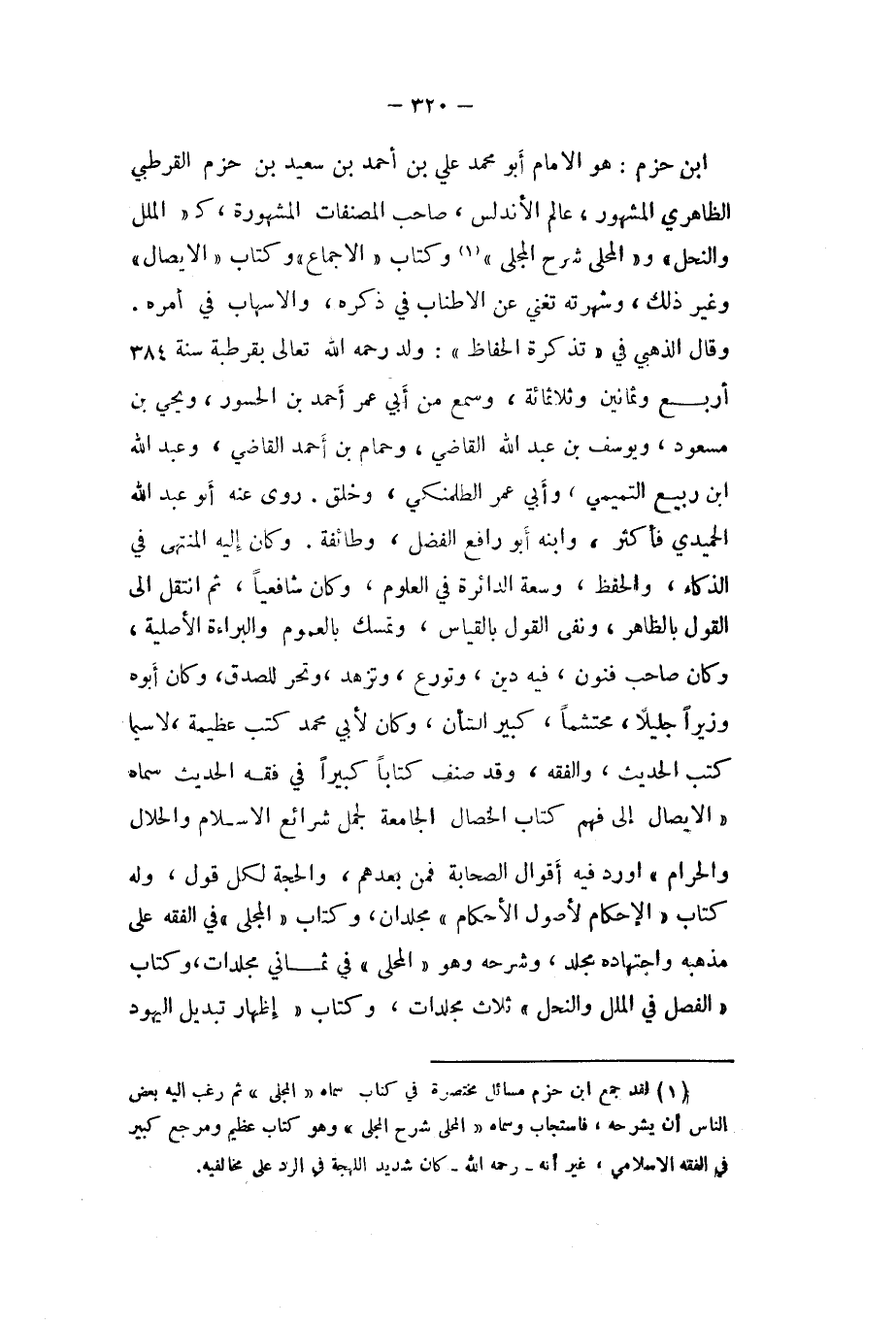 ابْن حزم هُوَ الامام أَبُو مُحَمَّد عَليّ بن أَحْمد بن سعيد بن حزم الْقُرْطُبِيّ الظَّاهِرِيّ الْمَشْهُور عَالم الاندلس صَاحب المصنفات الْمَشْهُورَة ك (الْملَل والنحل (و (الْمحلى شرح المجلى (وَكتاب (الاجماع (وَكتاب (الايصال (وَغير ذَلِك وشهرته تغني عَن الاطناب فِي ذكره والاسهاب فِي أمره وَقَالَ الذَّهَبِيّ فِي (تذكرة الْحَافِظ (ولد رَحمَه الله تَعَالَى بقرطبة سنة 384 أَربع وَثَمَانِينَ وثلاثمائة وَسمع من أبي عمر أَحْمد بن الحسور ويحي بن مَسْعُود ويوسف بن عبد الله القَاضِي وحمام بن أَحْمد القَاضِي وَعبد الله ابْن ربيع التَّمِيمِي وَأبي عمر الطلمنكي وَخلق روى عَنهُ ابوعبد الله الْحميدِي فَأكْثر وَابْنه ابو رَافع الْفضل وَطَائِفَة وَكَانَ أليه الْمُنْتَهى فِي الذكاء وَالْحِفْظ وسعة الدائرة فِي الْعُلُوم وَكَانَ شافعيا ثمَّ انْتقل الى القَوْل بِالظَّاهِرِ وَنفى القَوْل بِالْقِيَاسِ وَتمسك بِالْعُمُومِ والبراءة الاصلية وَكَانَ صَاحب فنون فِيهِ دين وتورع وتزهد وتحر للصدق وَكَانَ أَبوهُ وزيرا جَلِيلًا محتشما كَبِير الشَّأْن وَكَانَ لابي مُحَمَّد كتب عَظِيمَة لَا سِيمَا كتب الحَدِيث وَالْفِقْه وَقد صنف كتابا كَبِيرا فِي فقه الحَدِيث سَمَّاهُ (الايصال الى فهم كتاب الْخِصَال الجامعة لجمل شرائع الاسلام والحلال وَالْحرَام (اورد فِيهِ أَقْوَال الصَّحَابَة فَمن بعدهمْ وَالْحجّة لكل قَول وَله كتاب (الاحكام لاصول الاحكام (مجلدان وَكتاب (المجلى (فِي الْفِقْه على مذْهبه واجتهاده مُجَلد وَشَرحه وَهُوَ (الْمحلى فِي ثَمَانِي مجلدات وَكتاب (الْفَصْل فِي الْملَل والنحل (ثَلَاث مجلدات وَكتاب (إِظْهَار تَبْدِيل الْيَهُود