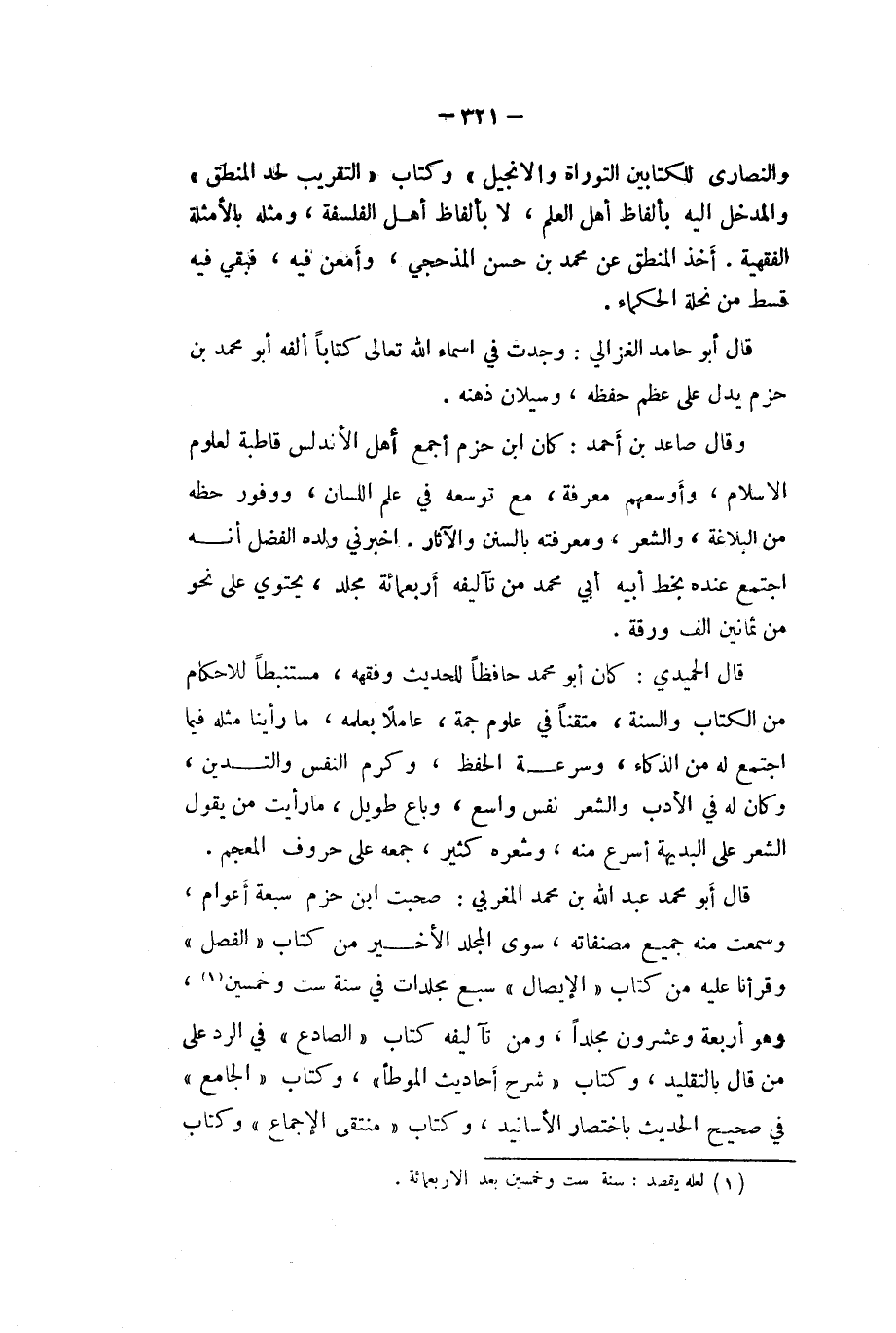 وَقَالَ صاعد بن أَحْمد كَانَ ابْن حزم أجمع أهل الاندلس قاطبة لعلوم الاسلام وأوسعهم معرفَة مَعَ توسعه فِي علم اللِّسَان ووفور حَظه من البلاغه وَالشعر ومعرفته بالسنن والْآثَار اخبرني وَلَده الْفضل أَنه اجْتمع عِنْده بِخَط أَبِيه أبي مُحَمَّد من تآليفه أَرْبَعمِائَة مُجَلد يحتوي على نَحْو من ثَمَانِينَ الف ورقة
