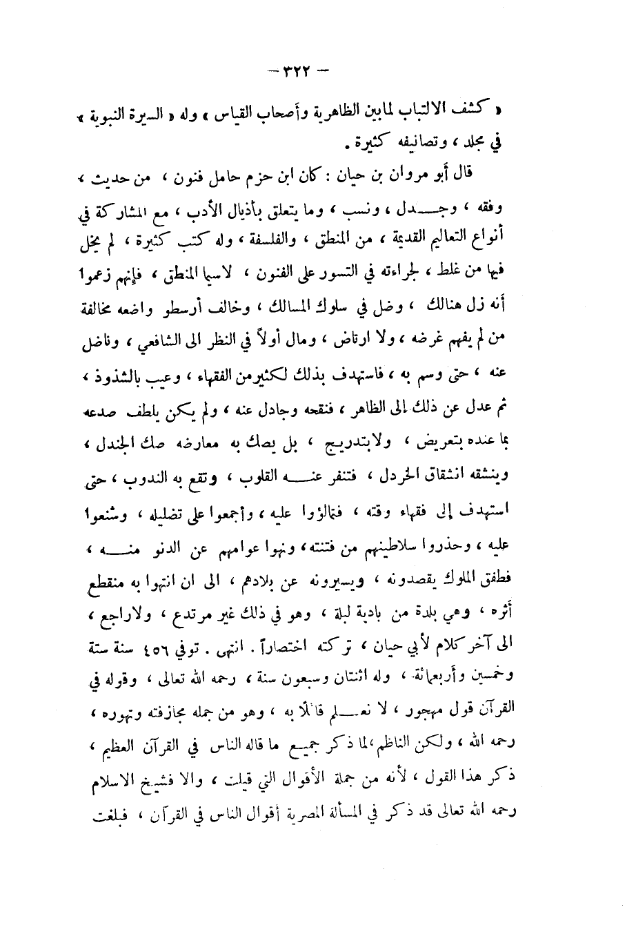 قَالَ أَبُو مَرْوَان بن حَيَّان كَانَ ابْن حزم حَامِل فنون من حَدِيث وَفقه وجدل وَنسب وَمَا يتَعَلَّق بأذيال الادب مَعَ الْمُشَاركَة فِي أَنْوَاع التعاليم الْقَدِيمَة من الْمنطق والفلسفة وَله كتب كَثِيرَة لم يخل فِيهَا من غلط لجراءته فِي التسور على الْفُنُون لاسيما الْمنطق فَإِنَّهُم زَعَمُوا انه زل هُنَالك وضل فِي سلوك المسالك وَخَالف أرسطو وَاضعه مُخَالفَة من لم يفهم غَرَضه وَلَا ارتاض وَمَال اولا فِي النّظر الى الشَّافِعِي وناضل عَنهُ حَتَّى وسم بِهِ فاستهدف بذلك لكثير من الْفُقَهَاء وعيب بالشذوذ ثمَّ عدل عَن ذَلِك الى الظَّاهِر فنقحه وجادل عَنهُ وَلم يكن يلطف صدعه بِمَا عِنْده بتعريض وَلَا بتدريج بل يصك بِهِ معارضه صك الجندل وينشقه انْشِقَاق الْخَرْدَل فتنفر عَنهُ الْقُلُوب وَتَقَع بِهِ الندوب حَتَّى استهدف الى فُقَهَاء وقته فتمالؤوا عَلَيْهِ وَأَجْمعُوا على تضليله وشنعوا عَلَيْهِ وحذروا سلاطينهم من فتنته ونهوا عوامهم عَن الدنو مِنْهُ فَطَفِقَ الْمُلُوك يقصدونه ويسيرونه عَن بِلَادهمْ الى ان انْتَهوا بِهِ مُنْقَطع أَثَره وَهِي بَلْدَة من بادية لبلة وَهُوَ فِي ذَلِك غير مرتدع وَلَا رَاجع الى آخر كَلَام لابي حَيَّان تركته اختصارا انْتهى توفّي 456 سنة سِتَّة وَخمسين وَأَرْبَعمِائَة وَله اثْنَتَانِ وَسَبْعُونَ سنة رَحمَه الله تَعَالَى وَقَوله فِي الْقُرْآن قَول مهجور لَا نعلم قَائِلا بِهِ وَهُوَ من جملَة مجازفته وتهوره رَحمَه الله وَلَكِن النَّاظِم لما ذكر جَمِيع مَا قَالَه النَّاس فِي الْقُرْآن الْعَظِيم ذكر هَذَا القَوْل لِأَنَّهُ من جملَة الْأَقْوَال الَّتِي قيلت وَإِلَّا فَشَيْخ الْإِسْلَام رَحمَه الله تَعَالَى قد ذكر فِي الْمَسْأَلَة المصرية أَقْوَال النَّاس فِي الْقُرْآن فبلغت