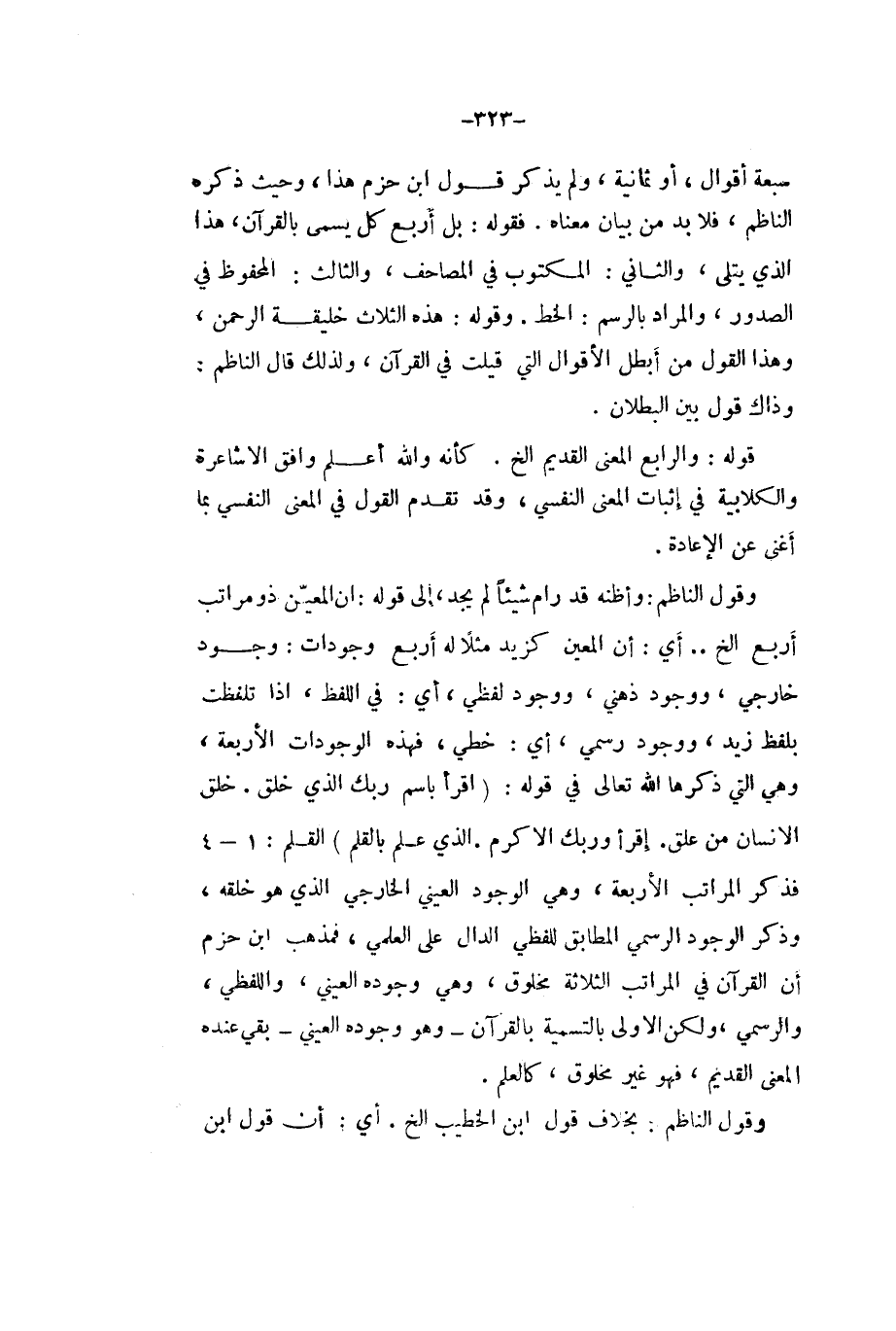 وَقَول النَّاظِم وَأَظنهُ قد رام شَيْئا لم يجد الى قَوْله ان الْمعِين ذُو مَرَاتِب أَربع الخ أَي ان الْمعِين كزيد مثلا لَهُ أَربع وجودات وجود خارجي وَوُجُود ذهني وَوُجُود لَفْظِي أَي فِي اللَّفْظ اذا تلفظت بِلَفْظ زيد وَوُجُود رسمي أَي خطي فَهَذِهِ الوجودات الاربعة وَهِي الَّتِي ذكرهَا الله تَعَالَى فِي قَوْله {اقْرَأ باسم رَبك الَّذِي خلق خلق الْإِنْسَان من علق اقْرَأ وَرَبك الأكرم الَّذِي علم بالقلم} الْقَلَم 1 4 فَذكر الْمَرَاتِب الاربعة وَهِي الْوُجُود الْعَيْنِيّ الْخَارِجِي الَّذِي هُوَ خلقه وَذكر الْوُجُود الرسمي المطابق للفظي الدَّال على العلمي فمذهب ابْن حزم أَن الْقُرْآن فِي الْمَرَاتِب الثَّلَاثَة مَخْلُوق وَهِي وجوده الْعَيْنِيّ واللفظي والرسمي وَلَكِن الاولى بِالتَّسْمِيَةِ بِالْقُرْآنِ وَهُوَ وجوده الْعَيْنِيّ بَقِي عِنْده الْمَعْنى الْقَدِيم فَهُوَ غير مَخْلُوق كَالْعلمِ