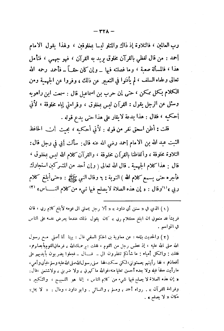 قلت أَظن اسحق نفر من قَوْله لاني أحكيه بِحَيْثُ أَن الْحَافِظ الثبت عبد الله بن الامام أَحْمد رَضِي الله عَنهُ قَالَ سَأَلت أبي فِي رجل قَالَ التِّلَاوَة مخلوقة وألفاظنا بِالْقُرْآنِ مخلوقة وَالْقُرْآن كَلَام الله لَيْسَ بمخلوق قَالَ هَذَا كَلَام الْجَهْمِية قَالَ الله تَعَالَى {وَإِن أحد من الْمُشْركين استجارك فَأَجره حَتَّى يسمع كَلَام الله} التَّوْبَة 6 وَقَالَ النَّبِي صلى الله عَلَيْهِ وَسلم (حَتَّى أبلغ كَلَام رَبِّي (وَقَالَ (إِن هَذِه الصَّلَاة لَا يصلح فِيهَا شَيْء من كَلَام النَّاس (