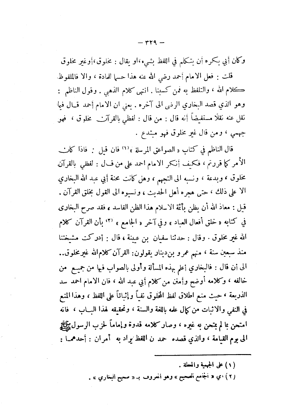 قَالَ النَّاظِم فِي كتاب (الصَّوَاعِق الْمُرْسلَة (فان قيل فاذا كَانَ الامر كَمَا قررتم فَكيف أنكر الامام احْمَد على من قَالَ لَفْظِي بِالْقُرْآنِ مَخْلُوق وبدعة وَنسبه الى التجهم وَهل كَانَت محنة أبي عبد الله البُخَارِيّ الا على ذَلِك حَتَّى هجره أهل الحَدِيث ونسبوه الى القَوْل بِخلق الْقُرْآن قيل معَاذ الله أَن يظنّ بأئمة الاسلام هَذَا الظَّن الْفَاسِد فقد صرح البُخَارِيّ فِي كِتَابه (خلق أَفعَال الْعباد (وَفِي آخر (الْجَامِع (بِأَن الْقُرْآن كَلَام الله غير مَخْلُوق وَقَالَ حَدثنَا سُفْيَان بن عُيَيْنَة قَالَ أدْركْت مشيختنا مُنْذُ سبعين سنة مِنْهُم عَمْرو بن دِينَار يَقُولُونَ الْقُرْآن كَلَام الله غير مَخْلُوق الى أَن قَالَ فَالْبُخَارِي أعلم بِهَذِهِ الْمَسْأَلَة وَأولى بِالصَّوَابِ فِيهَا من جَمِيع من خَالفه وَكَلَامه أوضح وأمتن من كَلَام أبي عبد الله فان الامام احْمَد سد الذريعة حَيْثُ منع اطلاق لفظ الْمَخْلُوق نفيا وإثباتا على اللَّفْظ وَهَذَا الْمَنْع فِي النَّفْي والاثبات من كَمَال علمه باللغة وَالسّنة وتحقيقه لهَذَا الْبَاب فَإِنَّهُ امتحن بِمَا لم يمْتَحن بِهِ غَيره وَصَارَ كَلَامه قدوة وإماما لحزب الرَّسُول صلى الله عَلَيْهِ وَسلم الى يَوْم الْقِيَامَة وَالَّذِي قَصده حمد ن اللَّفْظ يُرَاد بِهِ أَمْرَانِ أَحدهمَا